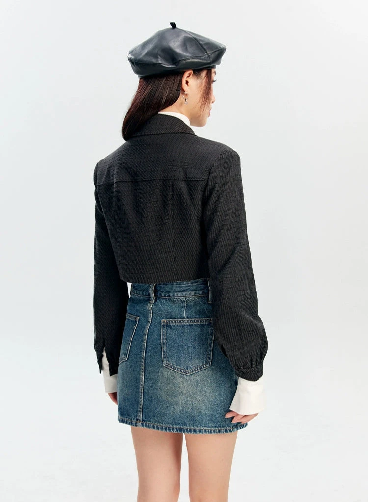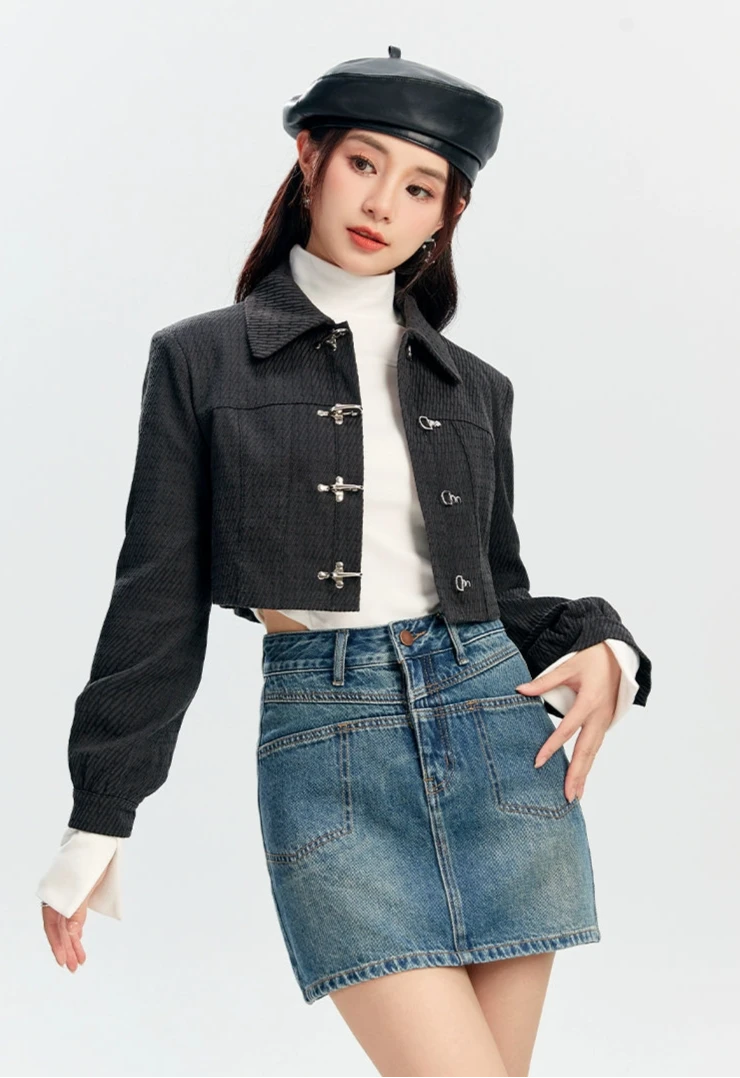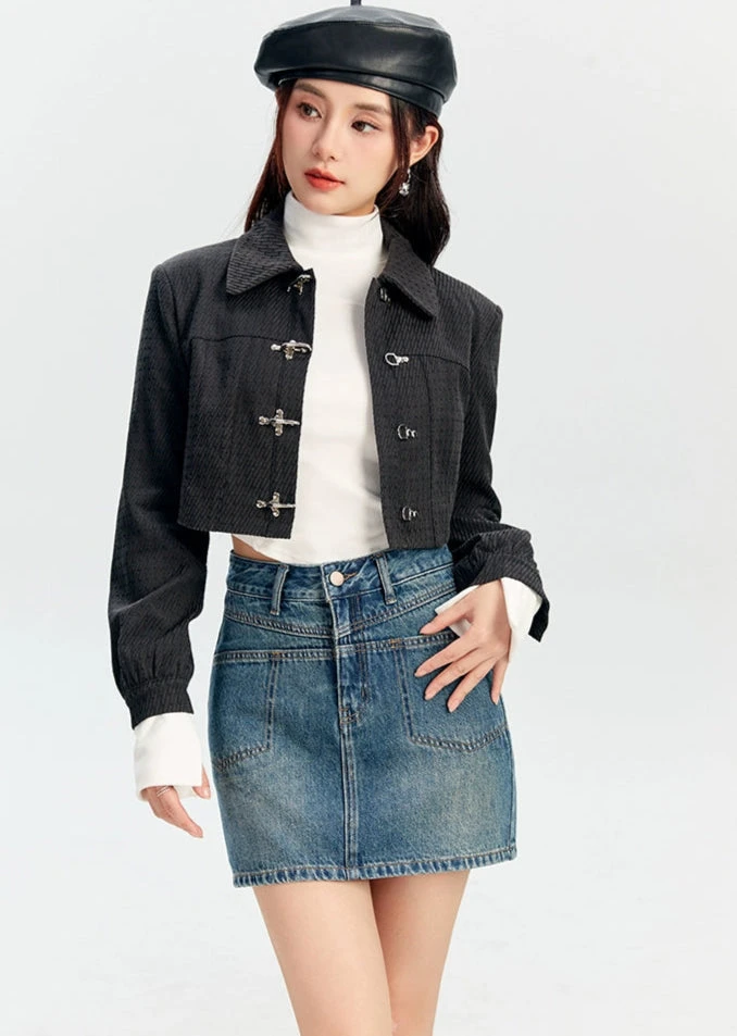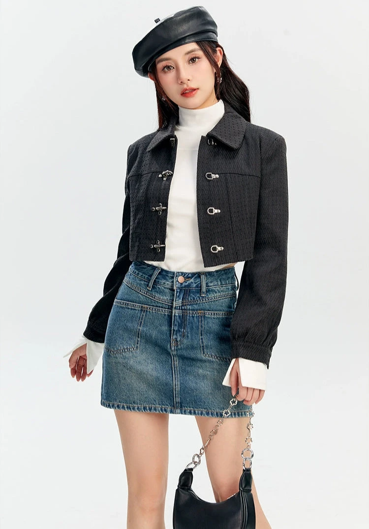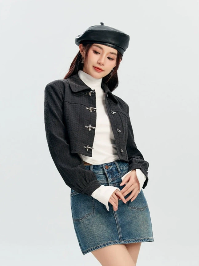 The Textured Fireman Clasp Cropped Collar Jacket brings a confident edge with its structured form and standout clasp detailing.