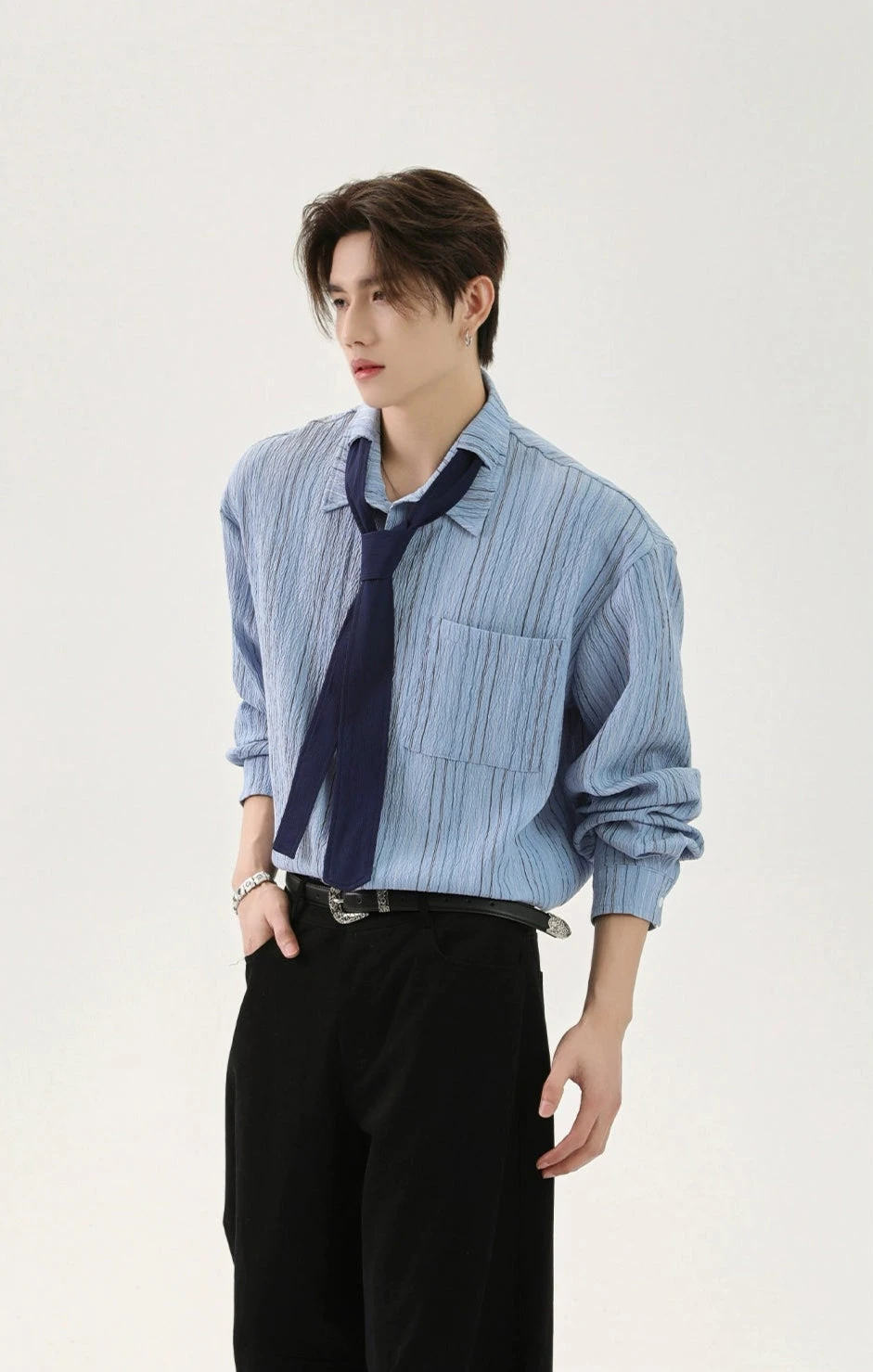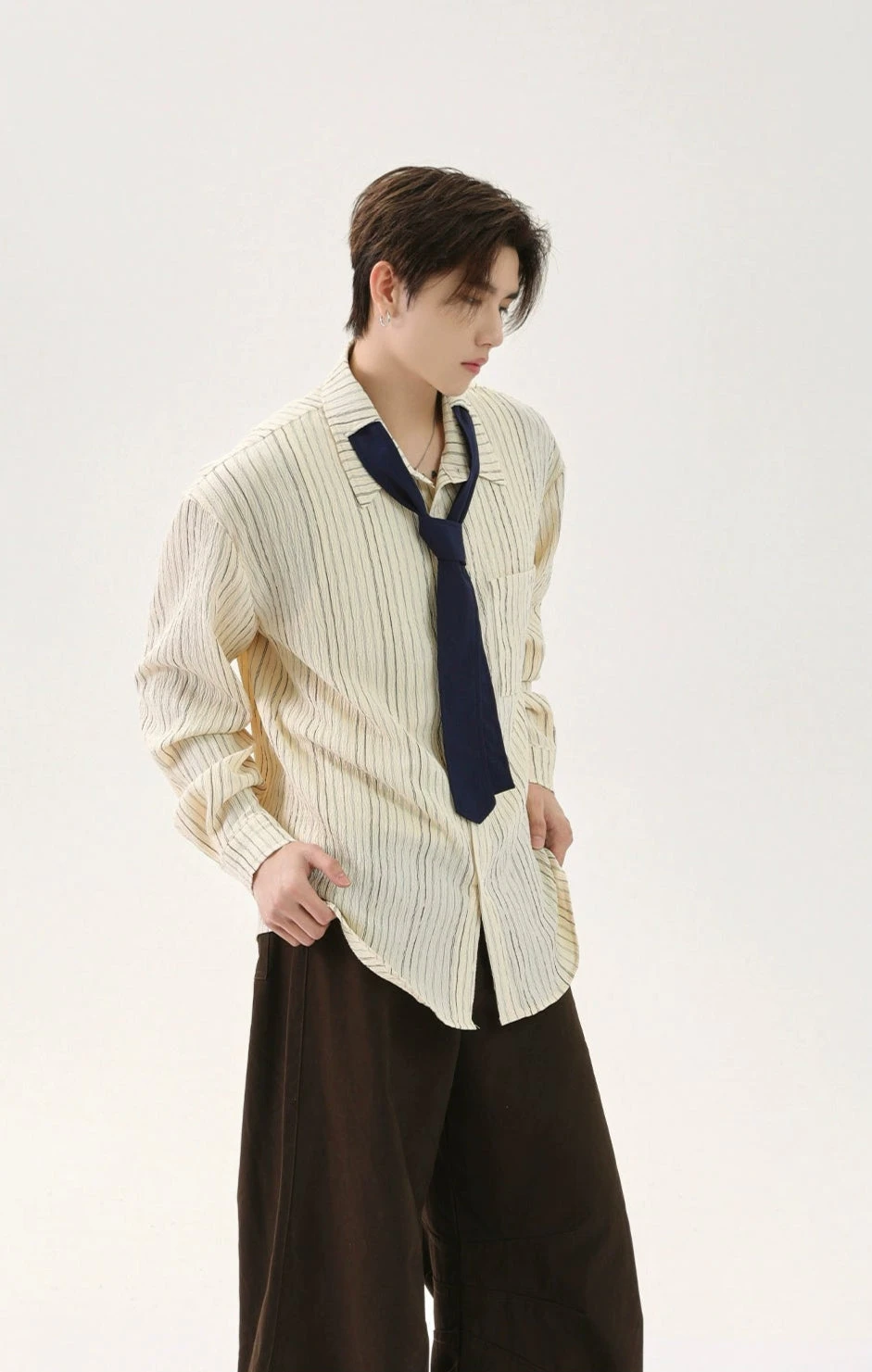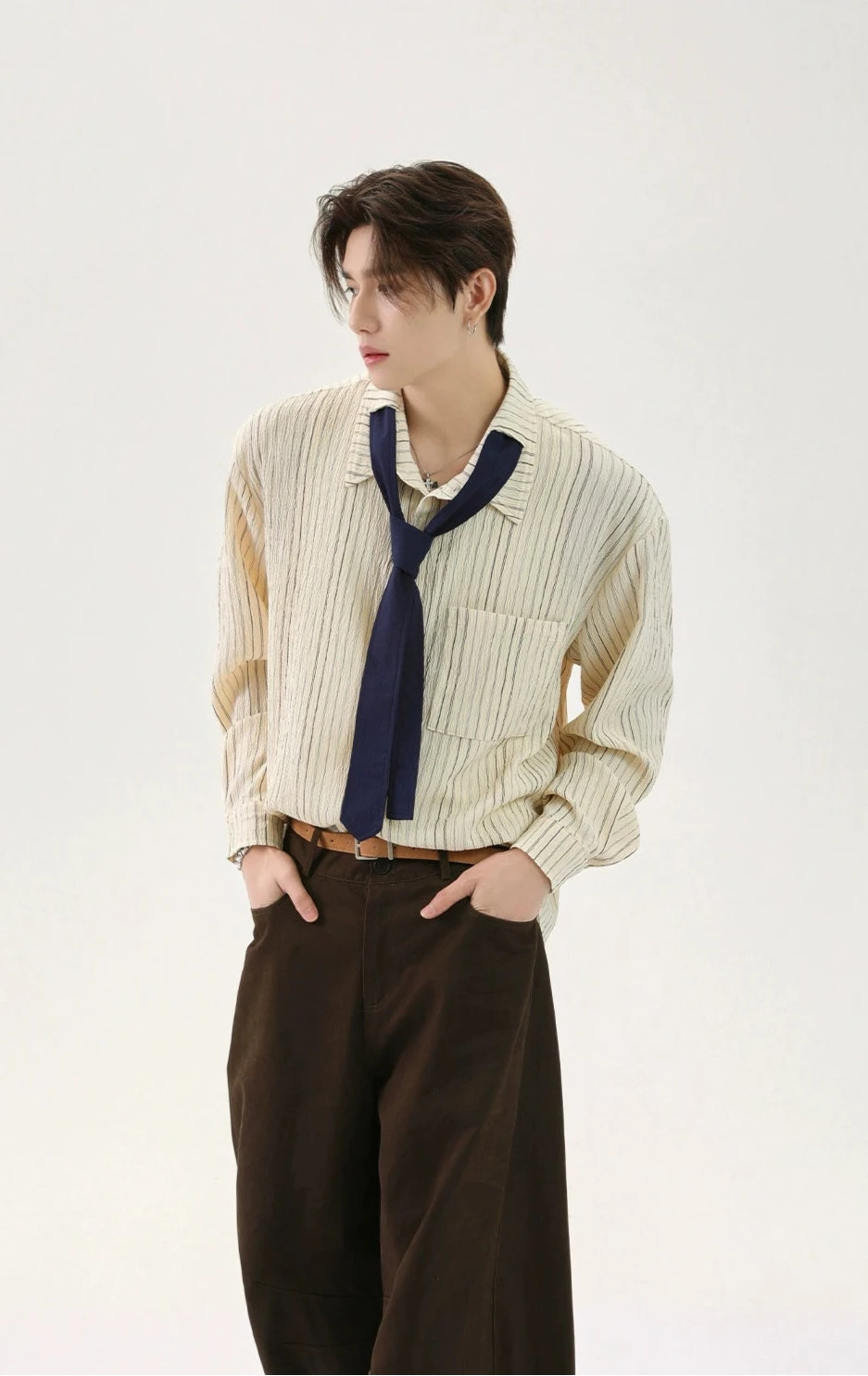 Crafted with care from a soft, durable fabric blend, it features an easy loose fit, drop shoulders, and a chest pocket for that relaxed but put-together feel. The contrast stripe pattern adds subtle dimension, while the lightweight structure gives it everyday versatility without sacrificing shape or form. I