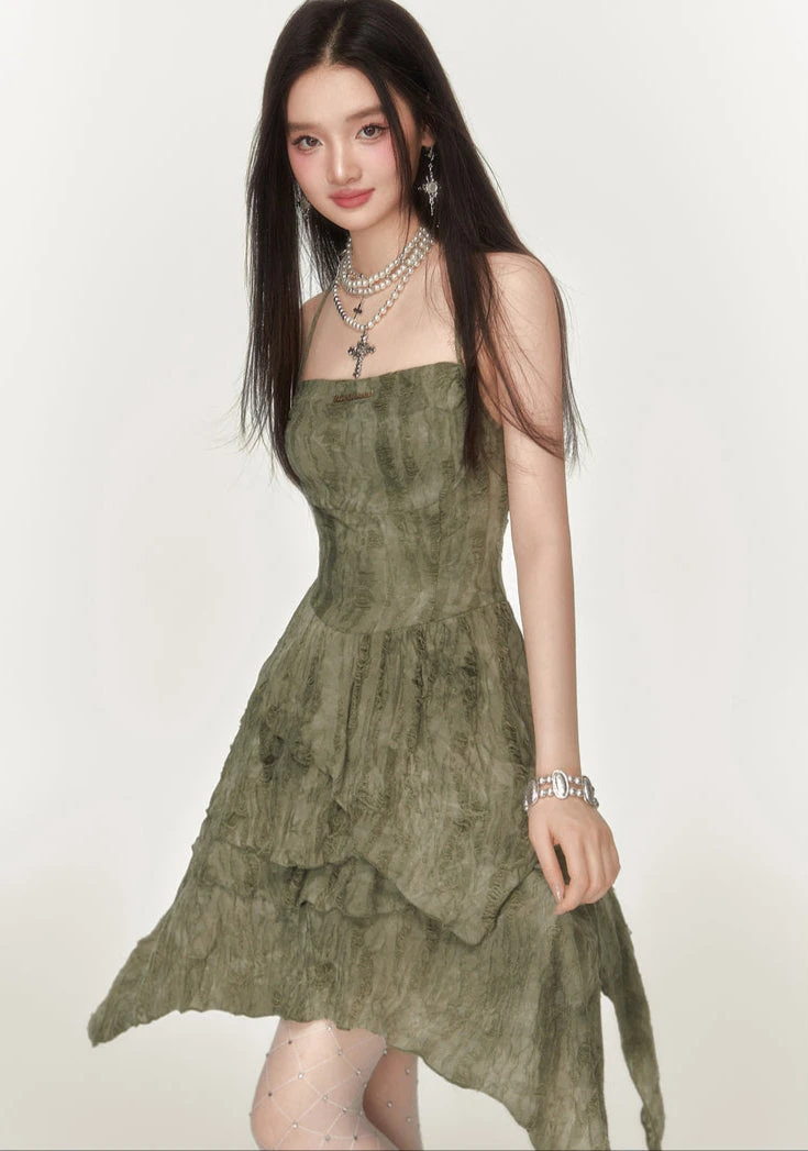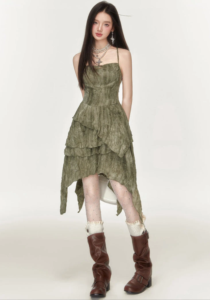 This mini dress features a layered ruffle hem and an open-back design with delicate crisscross straps for an effortless statement. The distressed-dye effect and soft, lightweight fabric give this piece an undone feel with a refined silhouette. The structured bodice complements the high-waisted cut, while the asymmetric tiered ruffles create movement.