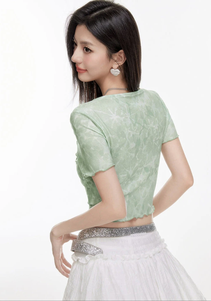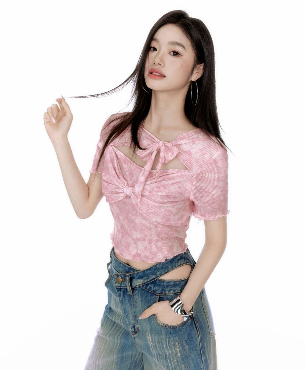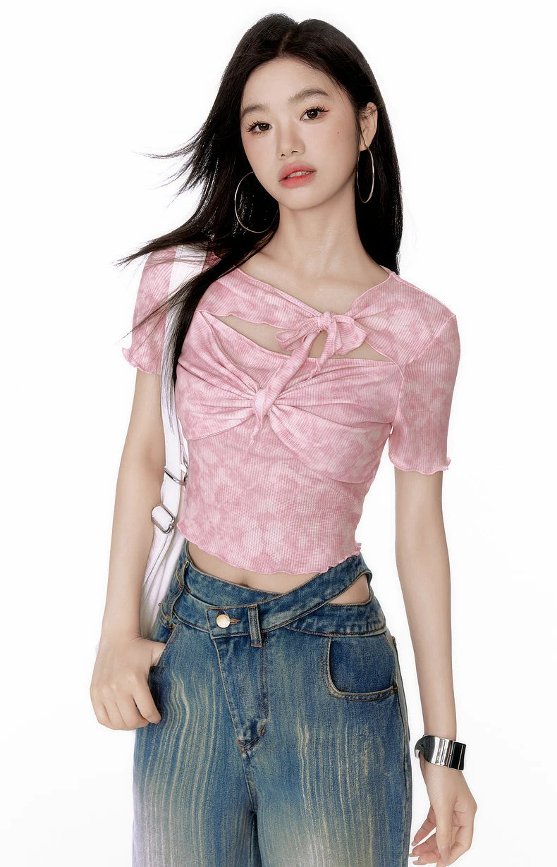Sleek and form-fitting, it blends soft texture with an edgy silhouette for a look that’s both playful and confident. Made from a breathable, lightweight fabric with a subtle texture, this short-sleeve top is all about the details—delicate ruching at the bust, raw-edge trim, and a flattering cropped length. The tie knot at the neckline adds a touch of moodiness, perfect for balancing sweet and sharp aesthetics.