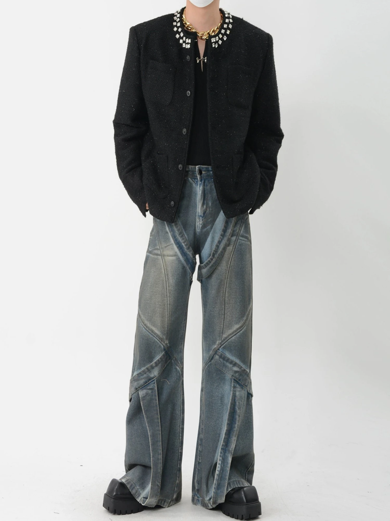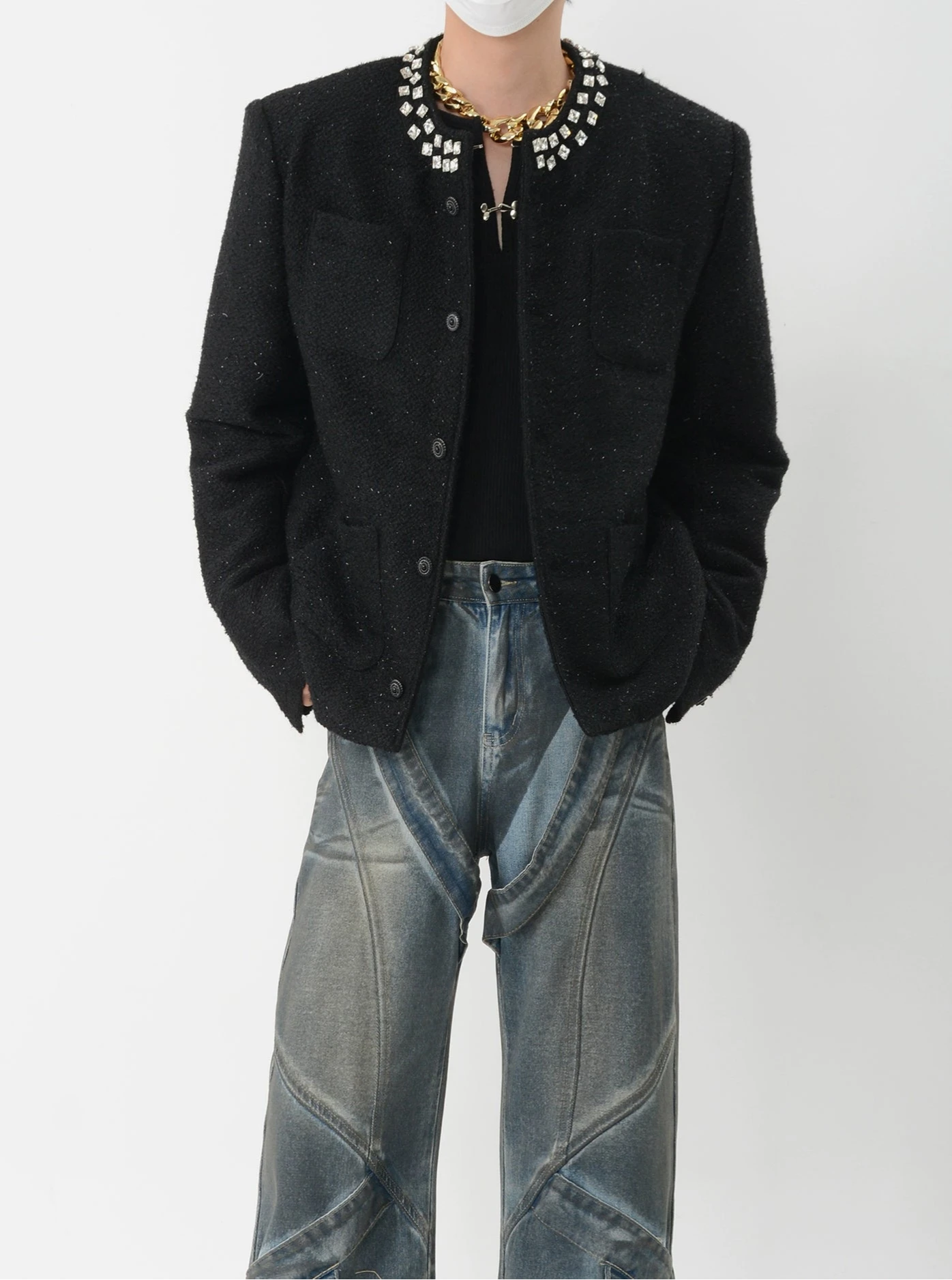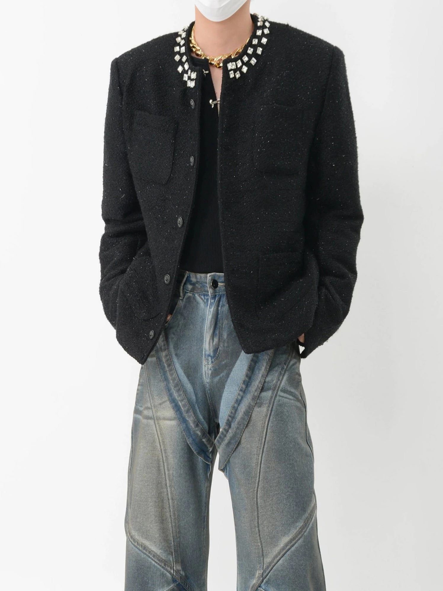 Elevate your outerwear game with the Tweed Embellished Collar Multi-Pocket Coat, a statement piece that effortlessly blends edgy sophistication with functional style.