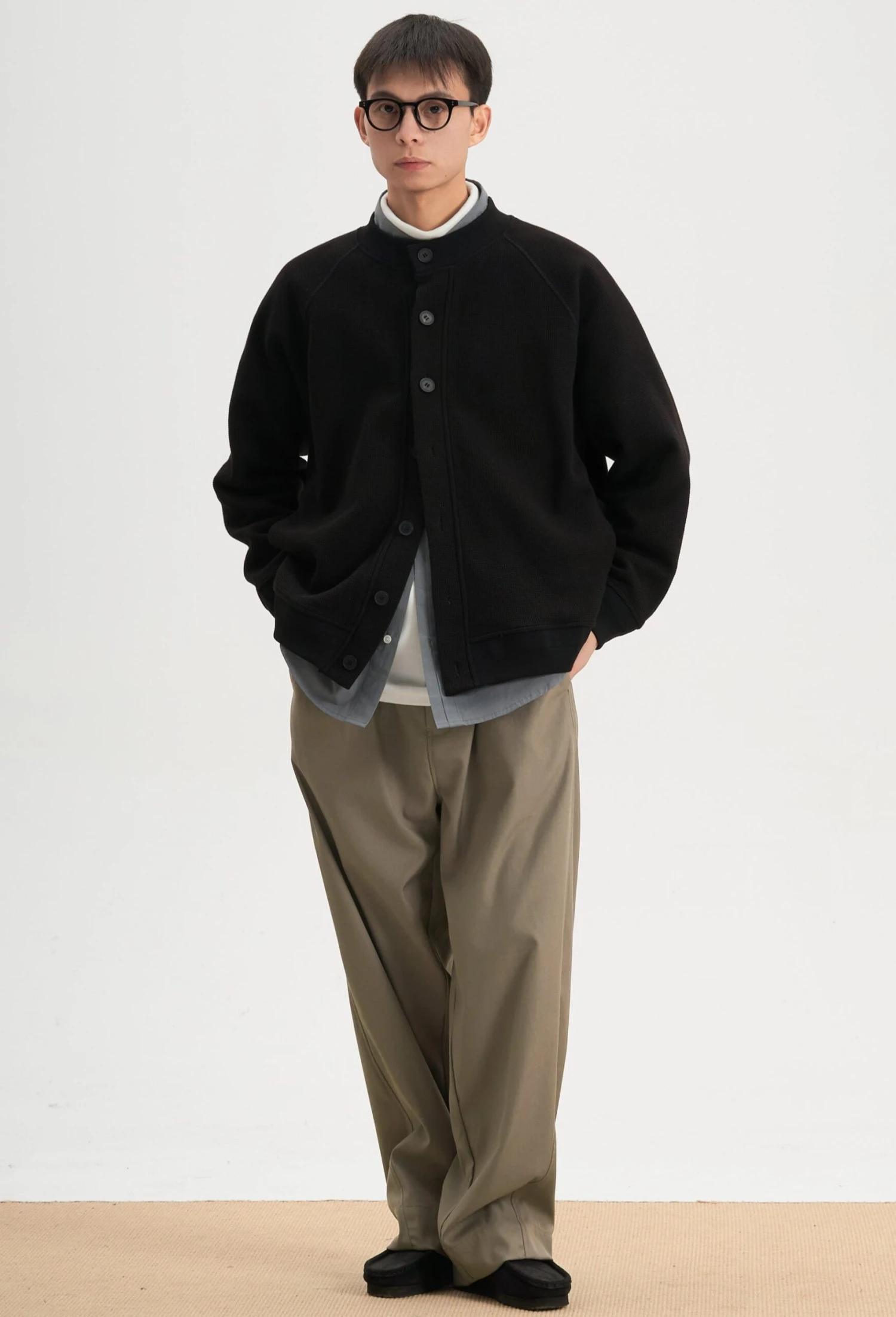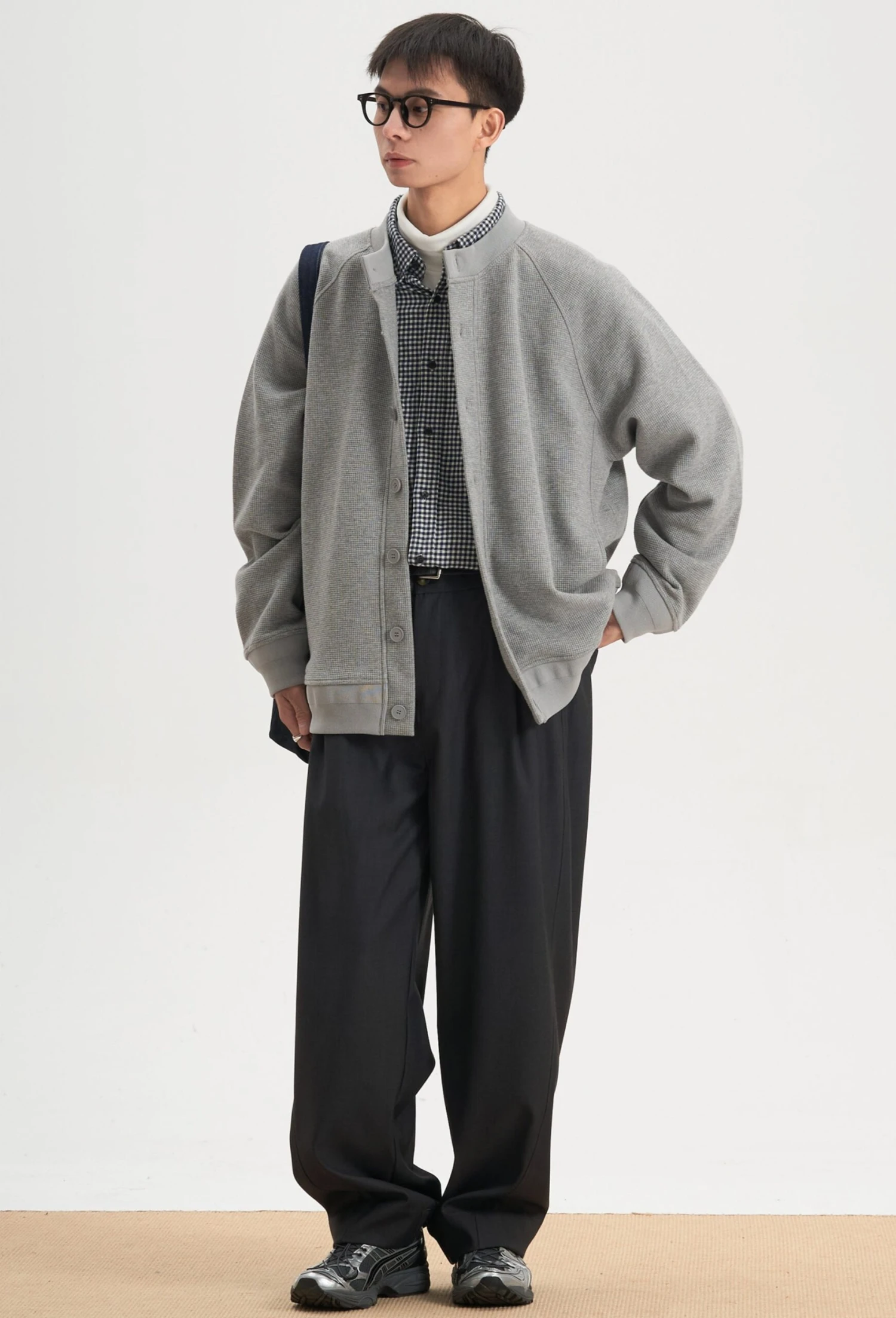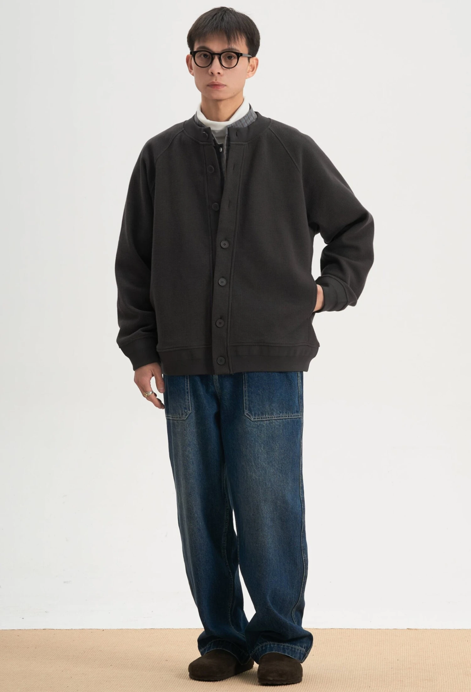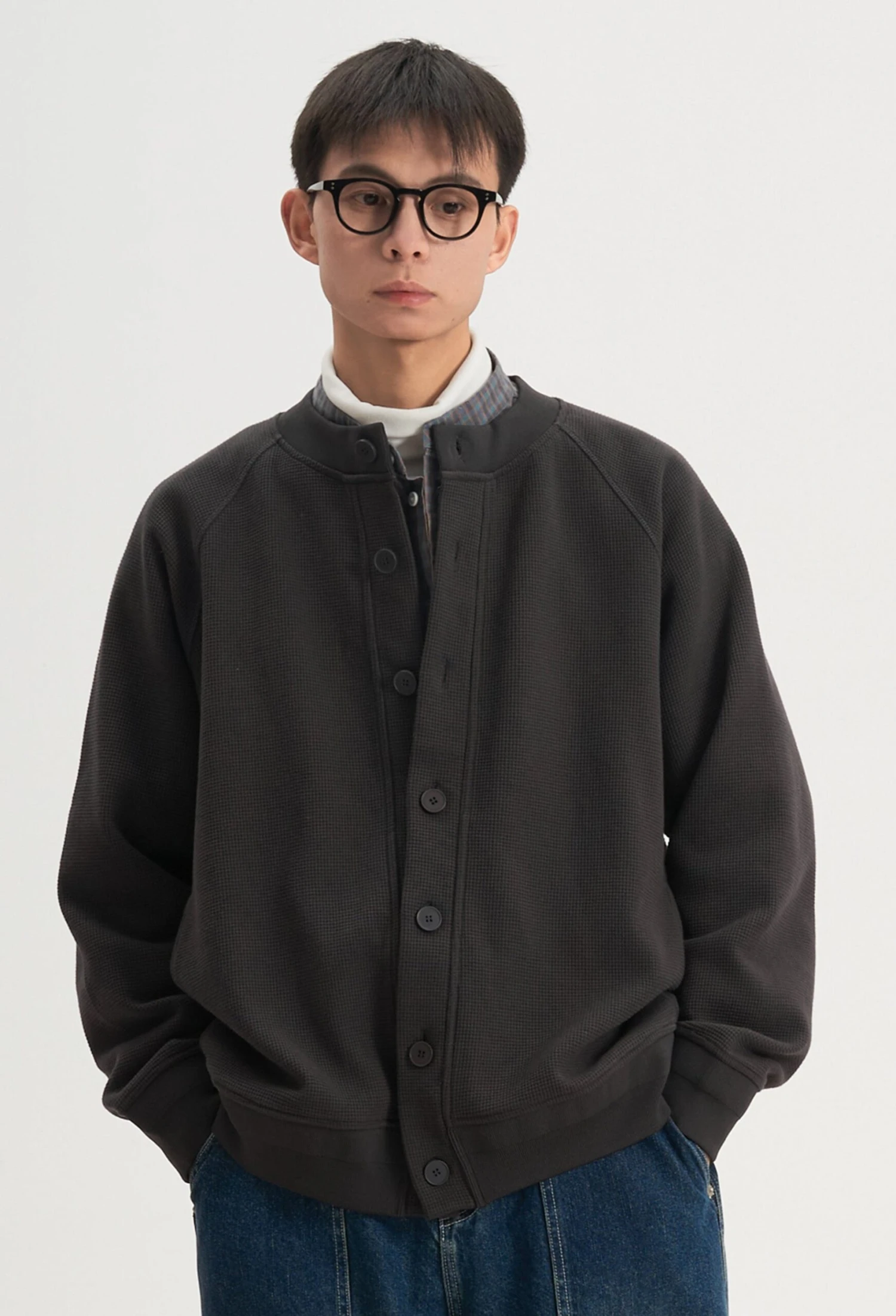 Built from a heavyweight 400g knit fabric, it balances warmth and breathability, making it an easy staple for layering. The textured waffle weave adds dimension while maintaining a soft, flexible feel. Thoughtfully crafted with reinforced stitching and ribbed detailing at the collar, cuffs, and hem, it delivers a comfortable yet structured drape. Raglan sleeves enhance mobility, and spacious side pockets offer function without disrupting the clean aesthetic.