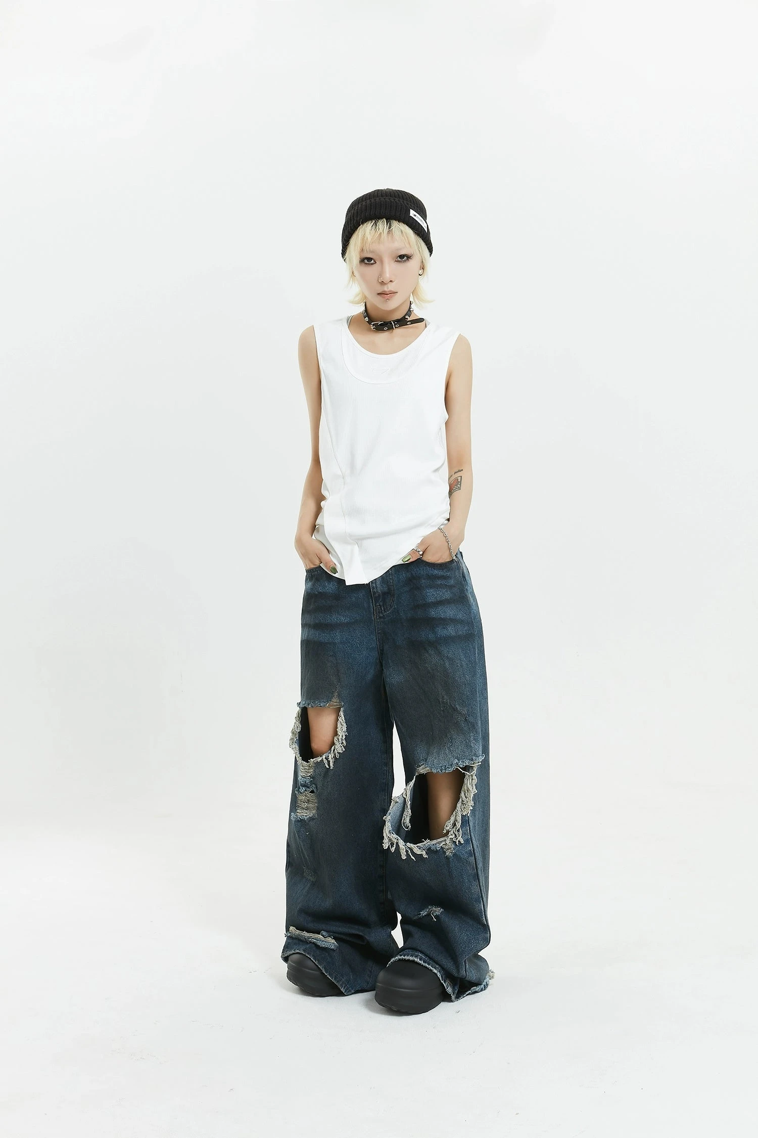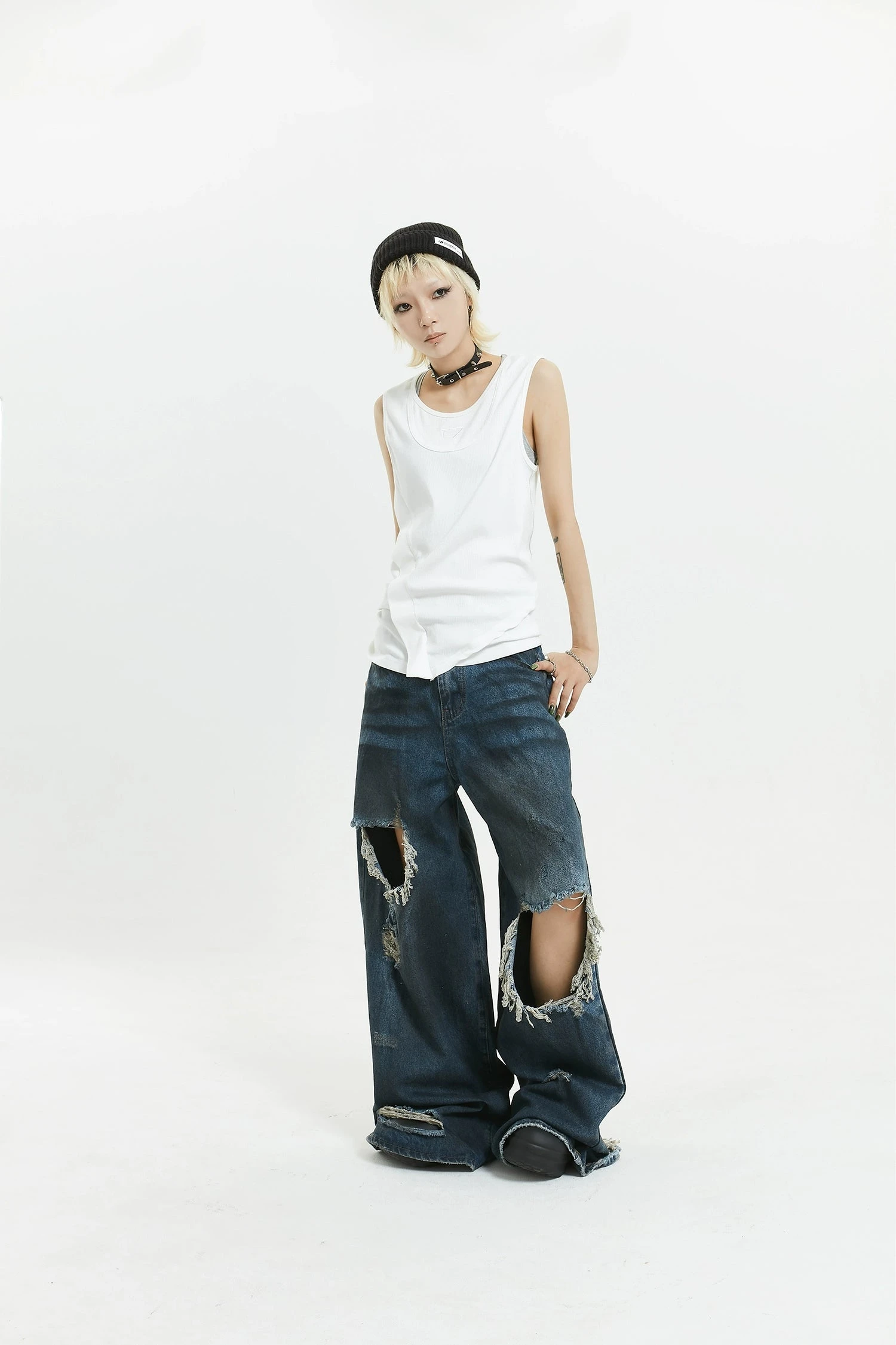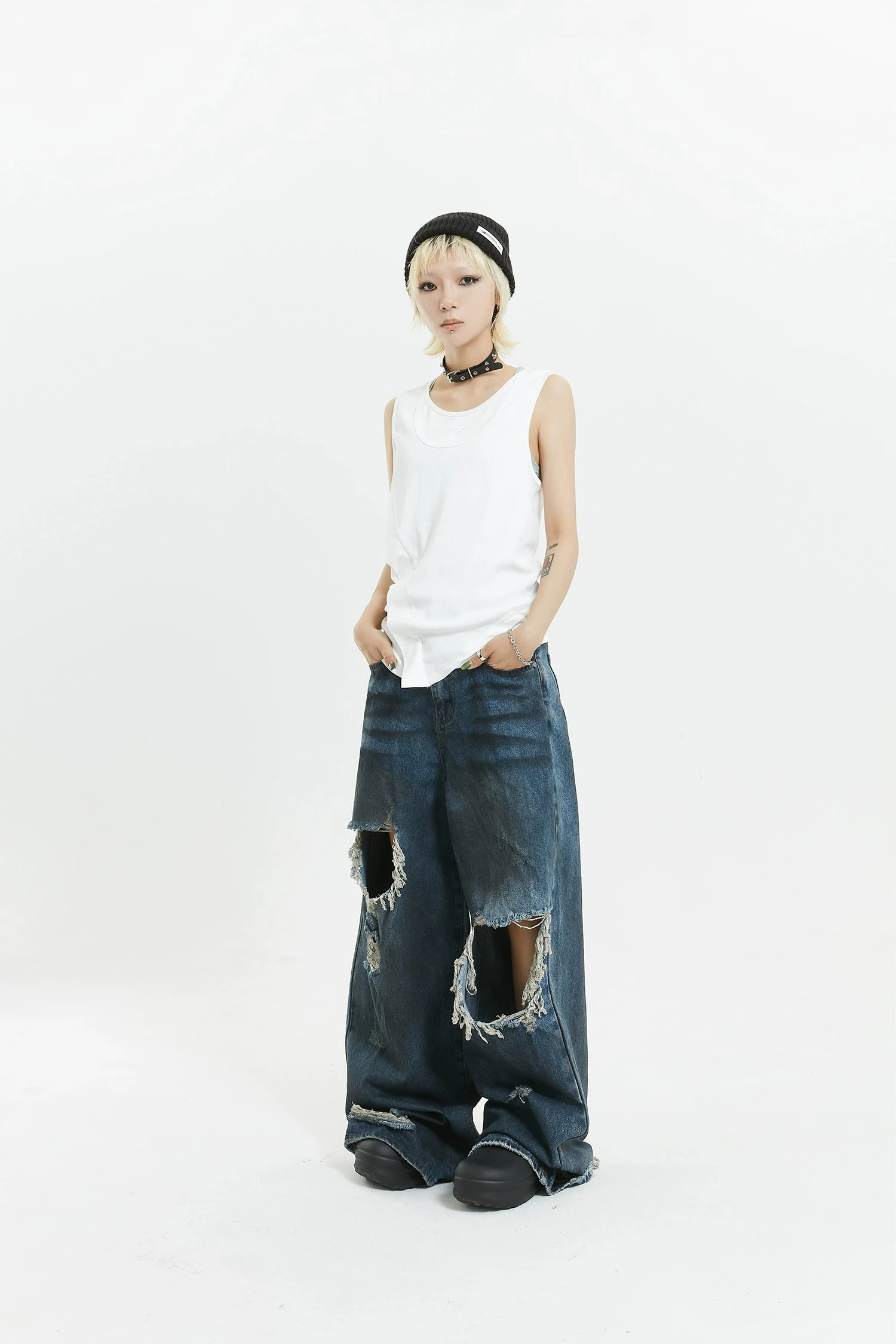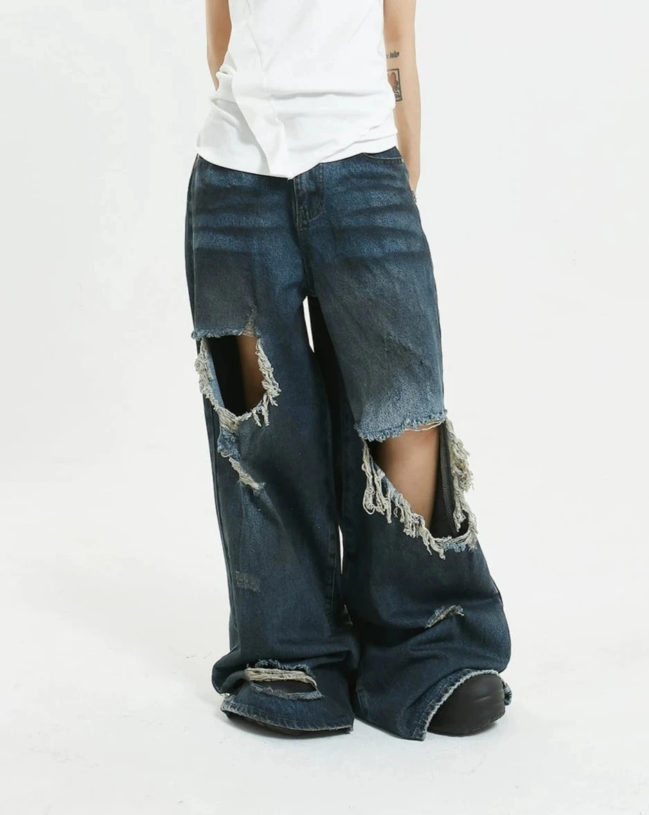 Experience effortless style with our Wide-Leg Distressed Knee-Blown Denim Jeans, the ultimate fusion of fashion and comfort.