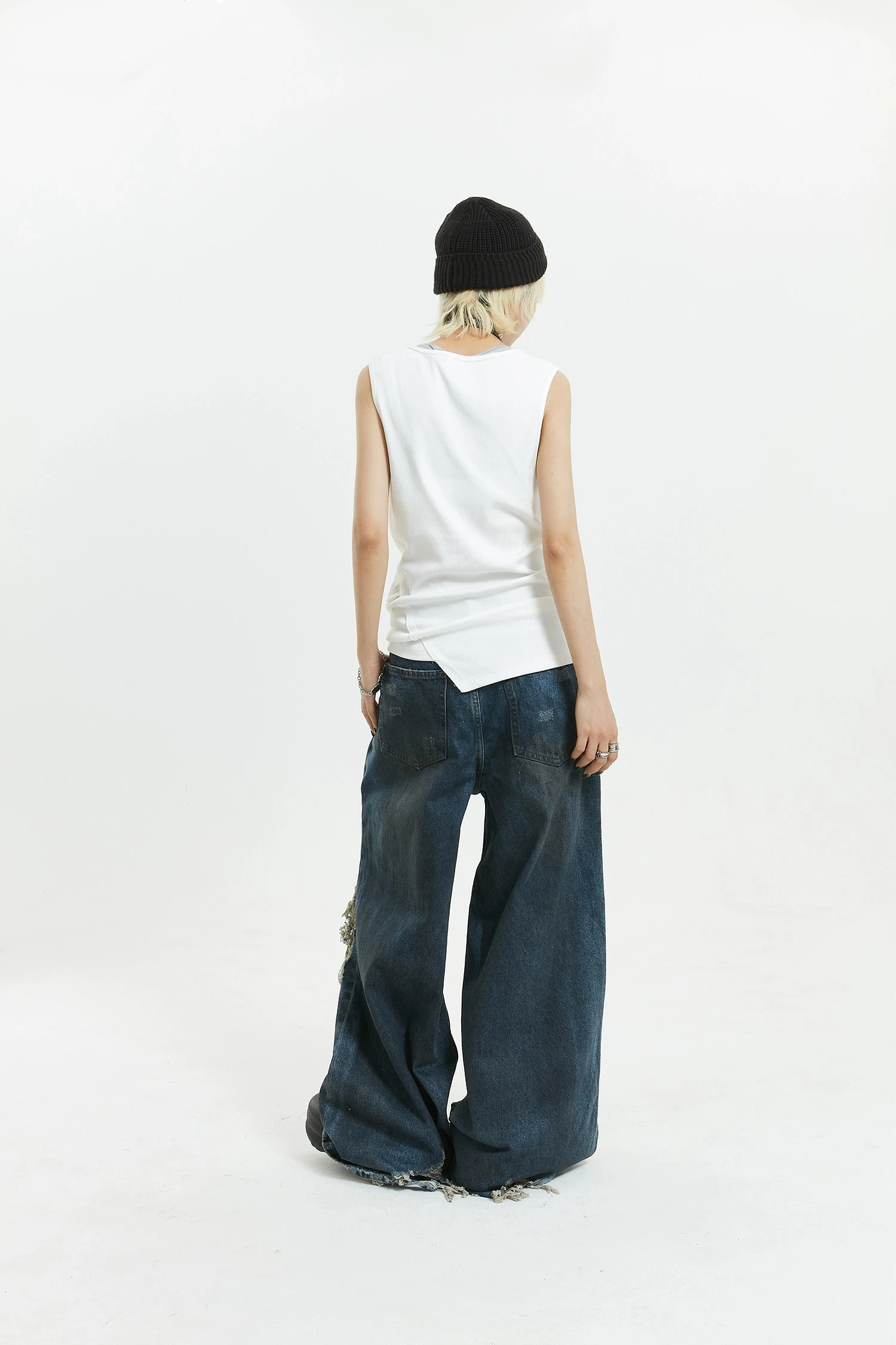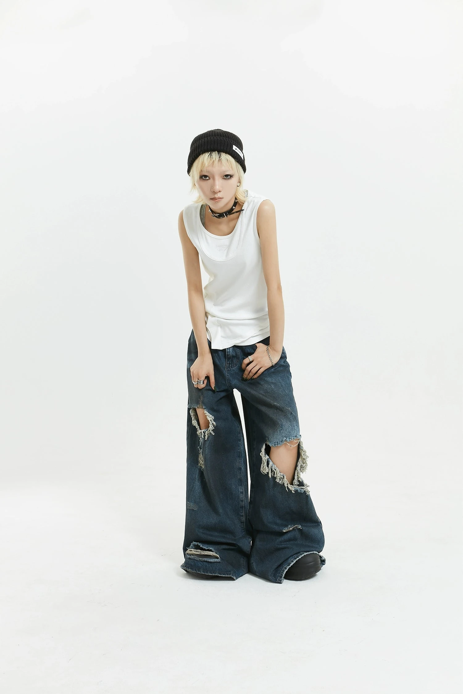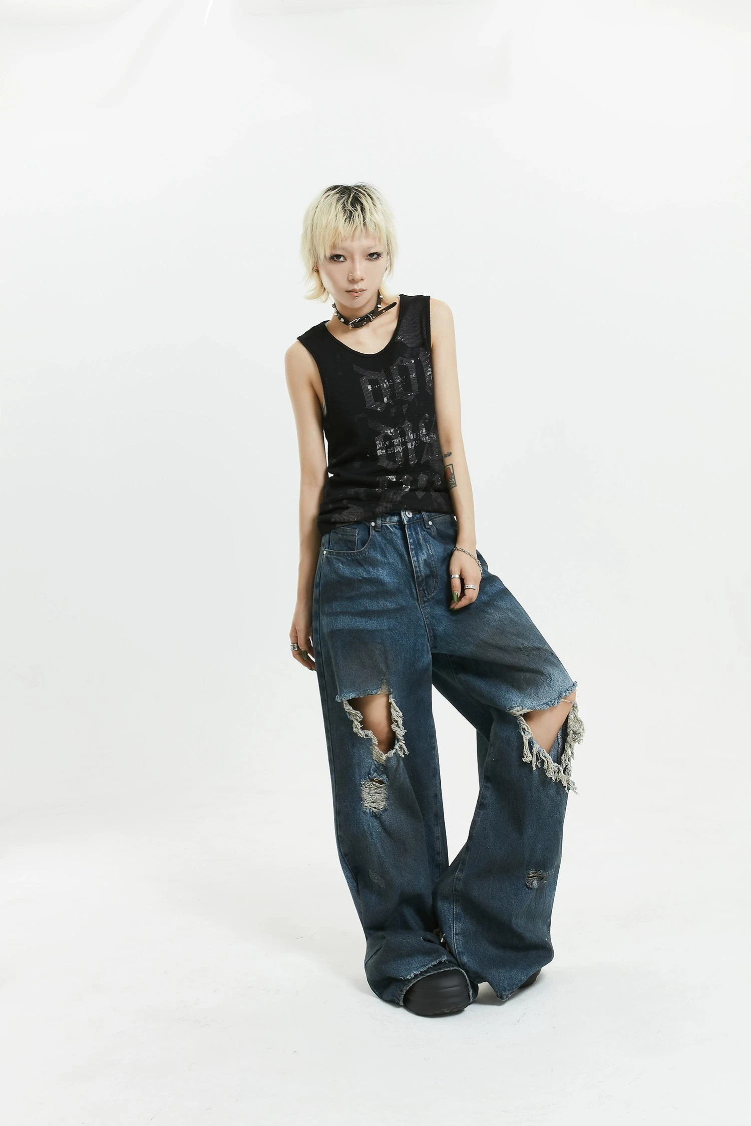 Experience effortless style with our Wide-Leg Distressed Knee-Blown Denim Jeans, the ultimate fusion of fashion and comfort.