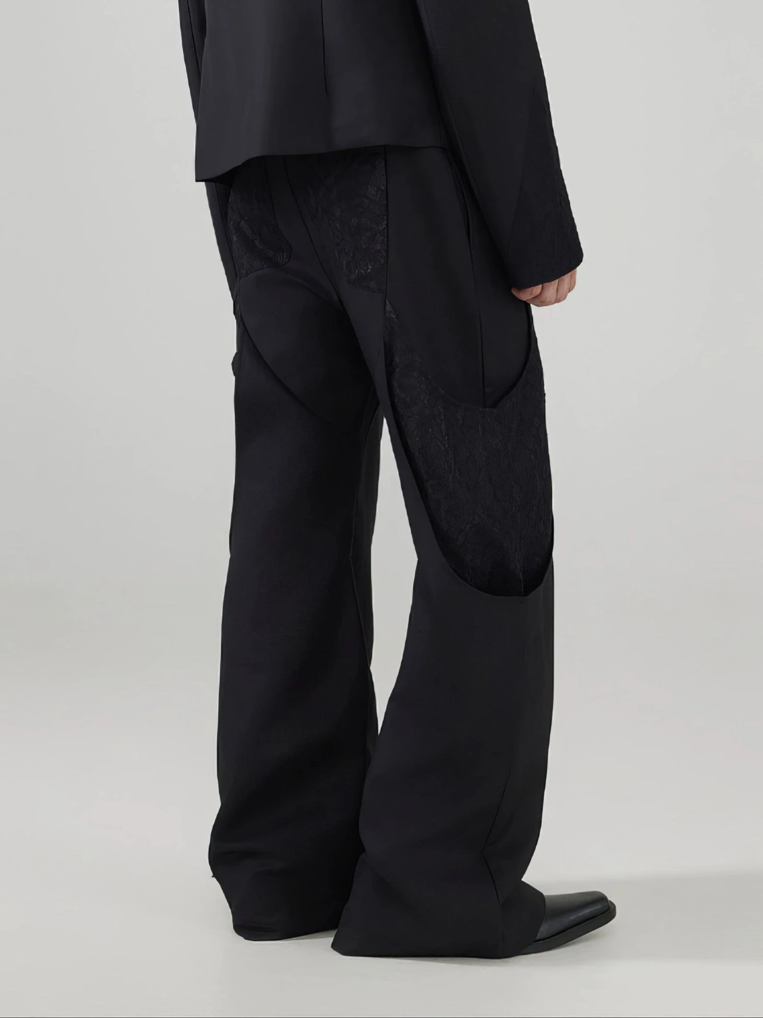The wide-leg paneled suit trousers with lace patchwork bring a bold yet refined contrast, blending structure with texture for a look that’s effortlessly sharp.