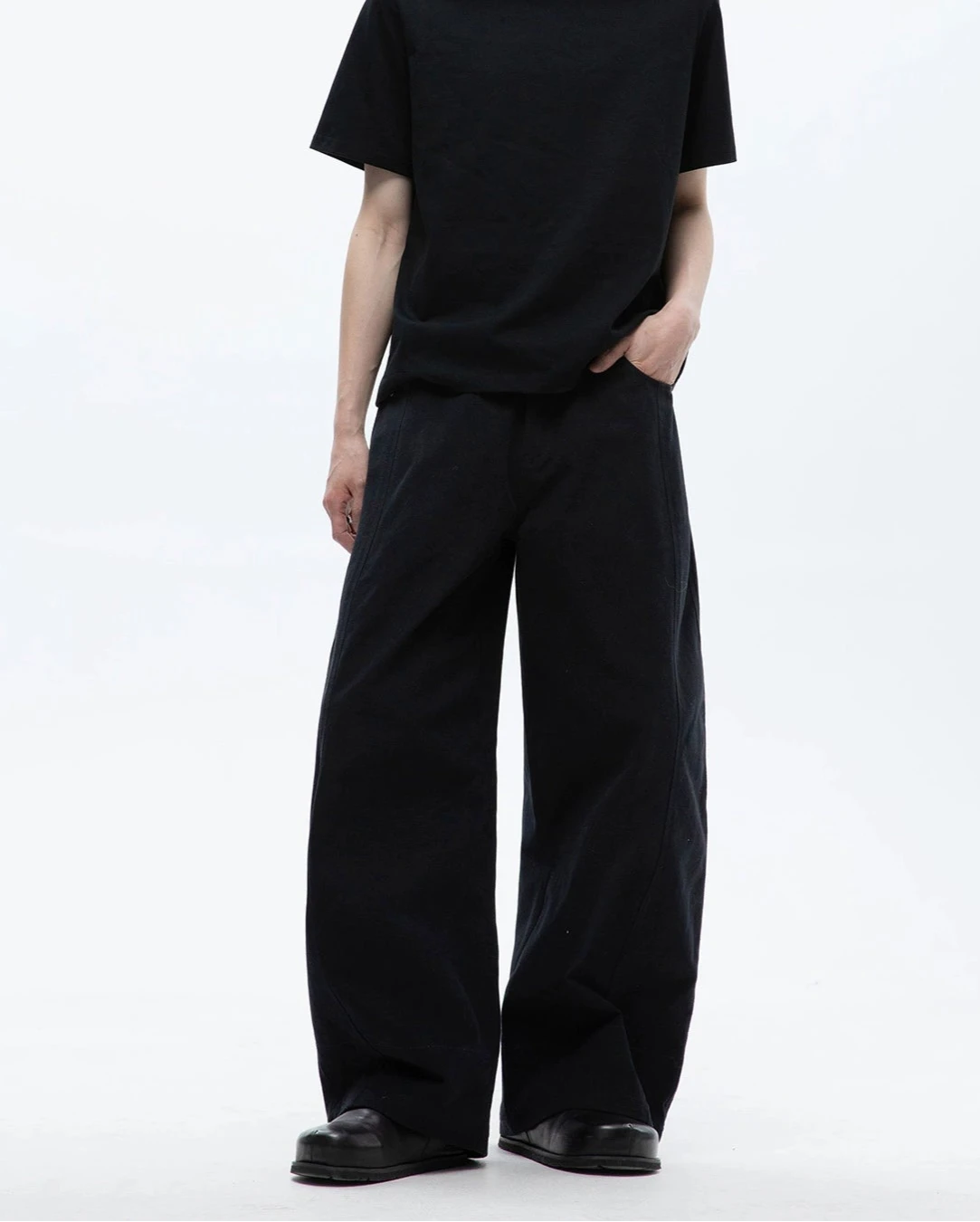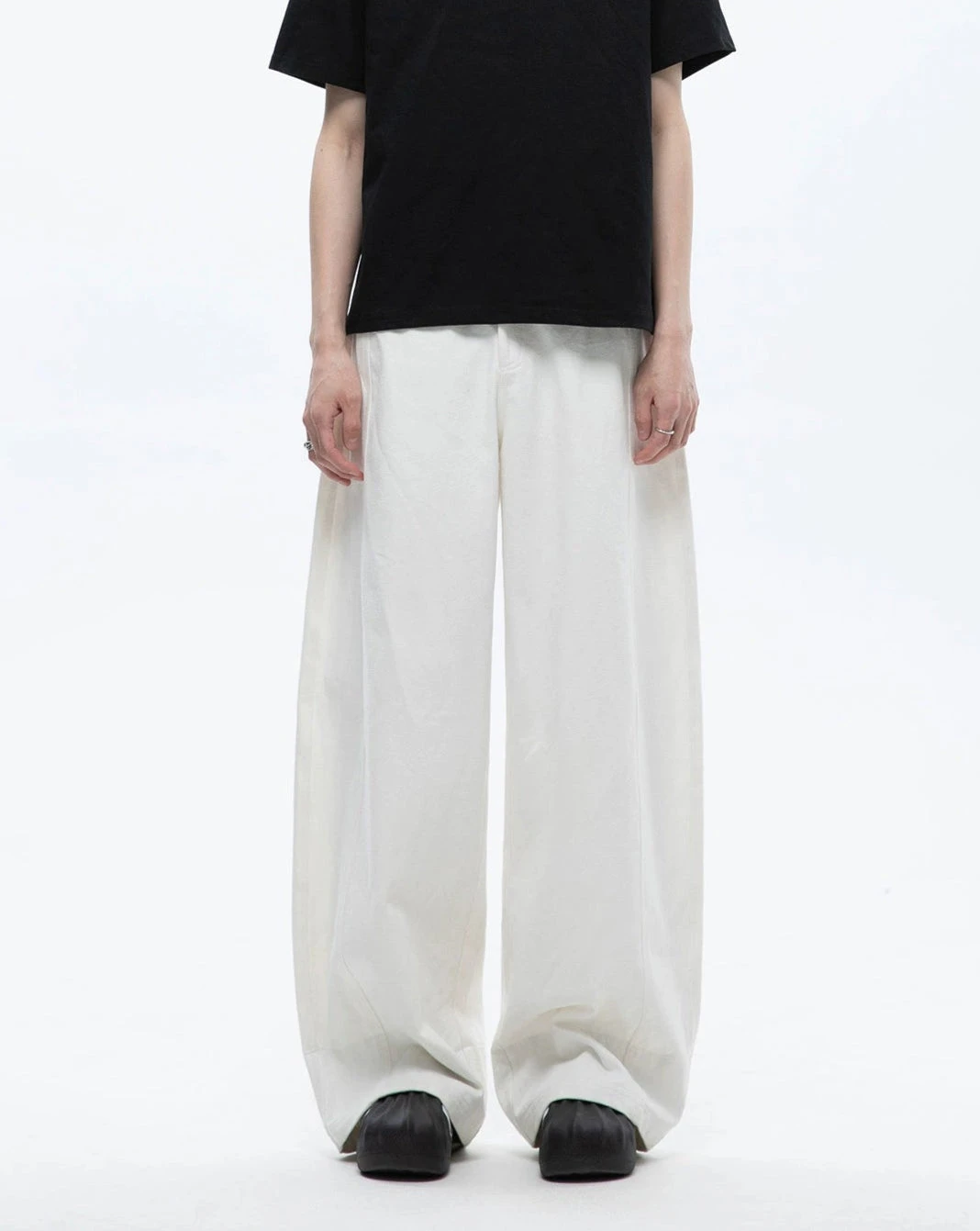 Crafted from a breathable cotton blend, these trousers feature a straight, loose fit with a mid-rise waist and a lightly structured drape that gives them both comfort and shape. The contrast detailing adds just enough texture to keep your look clean but far from basic.
