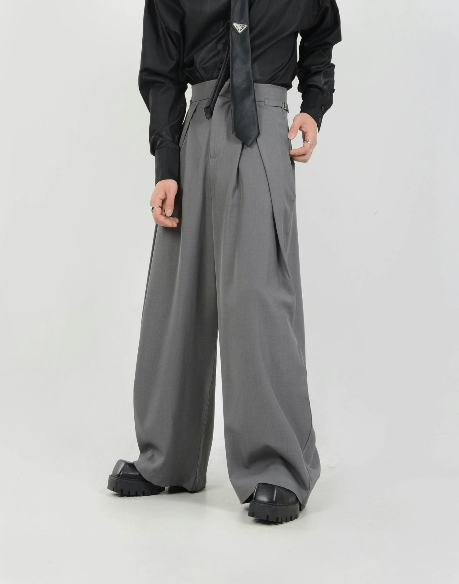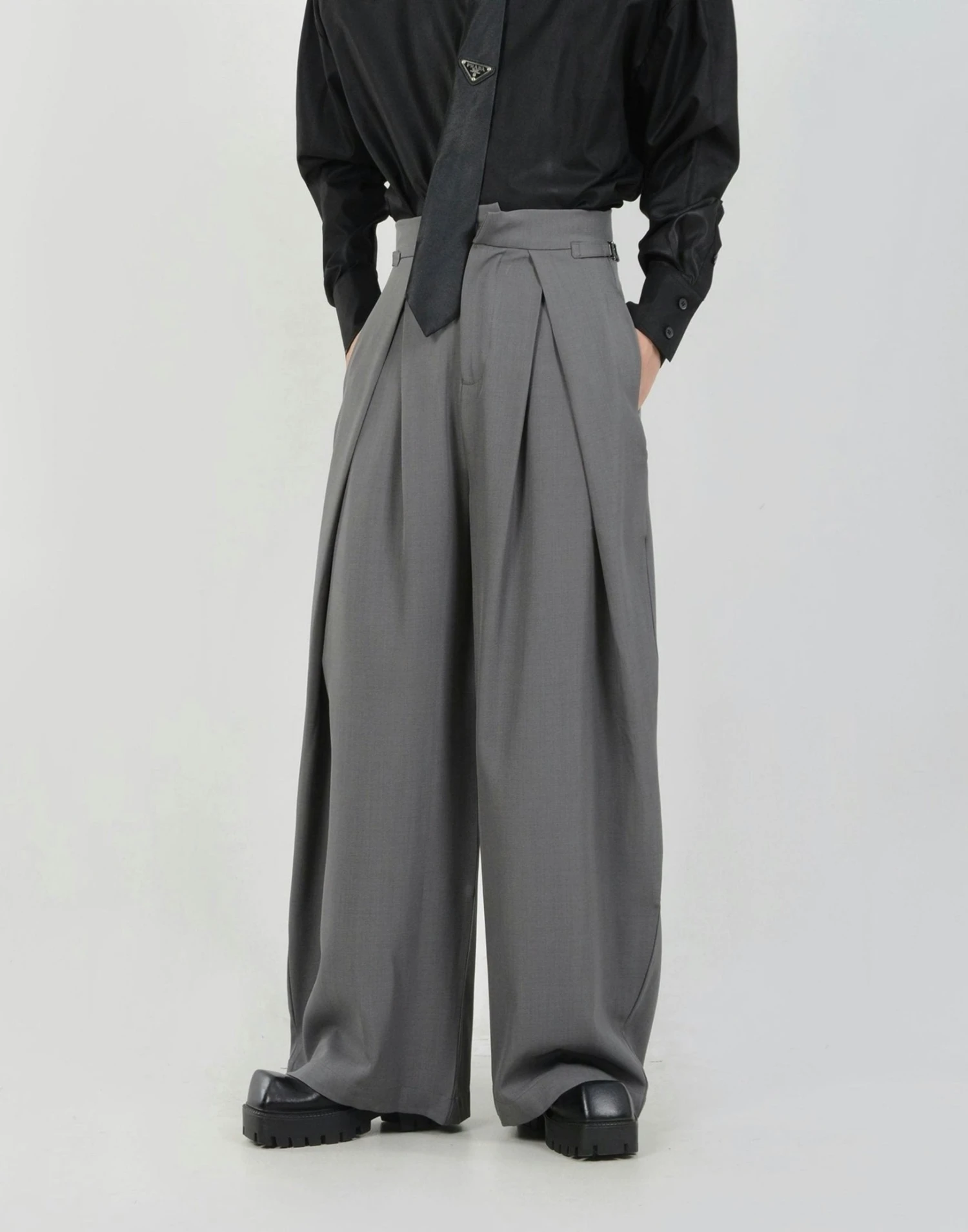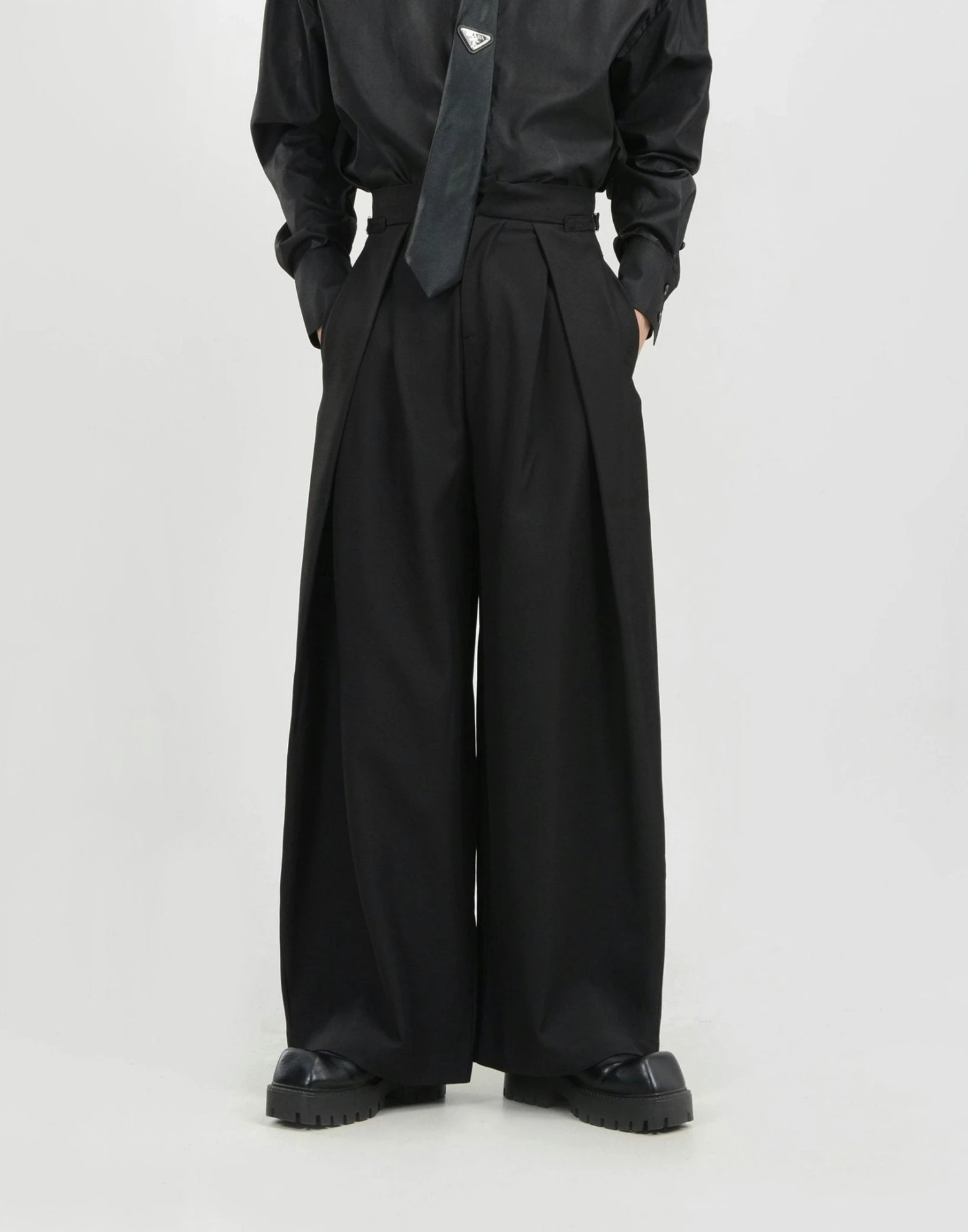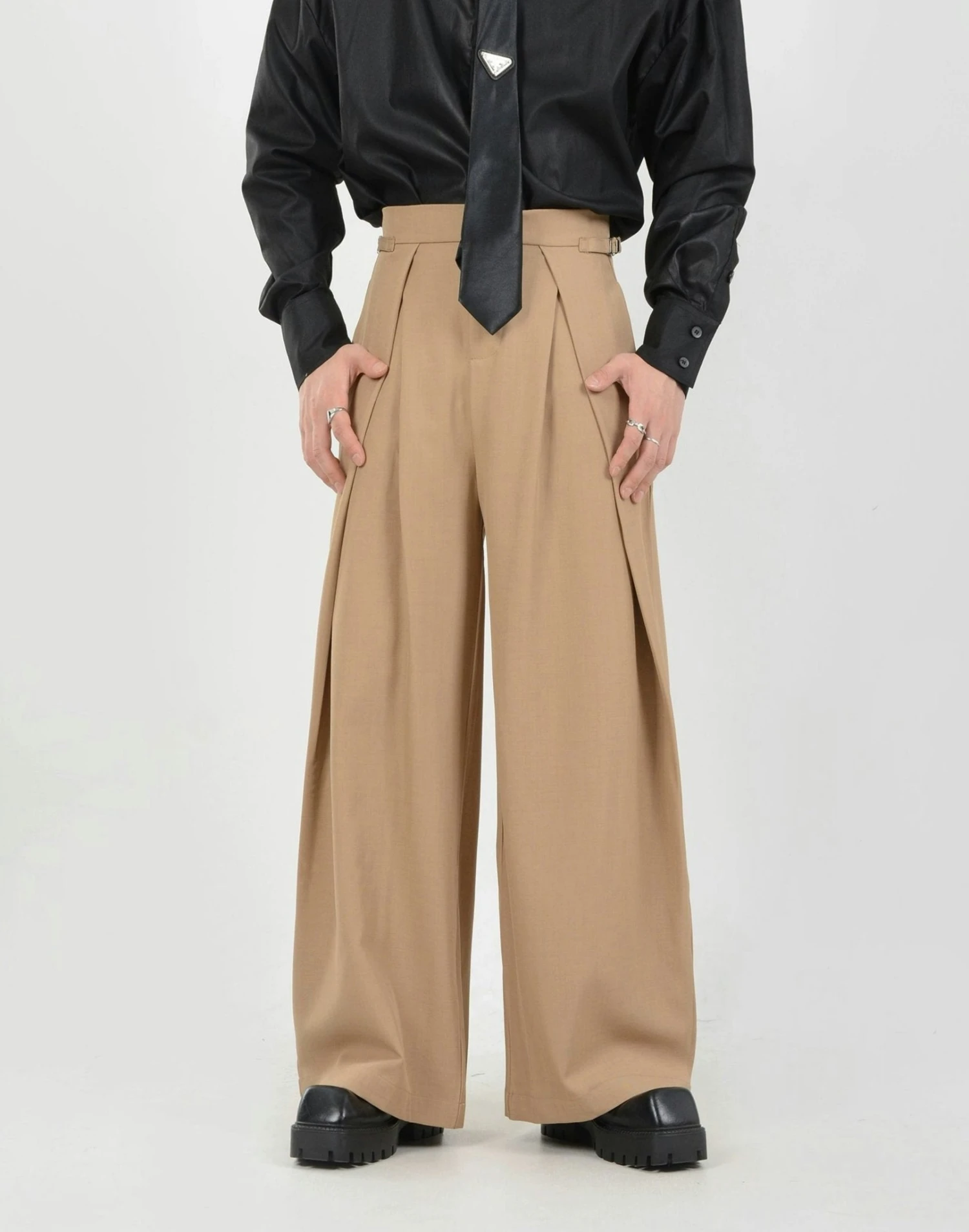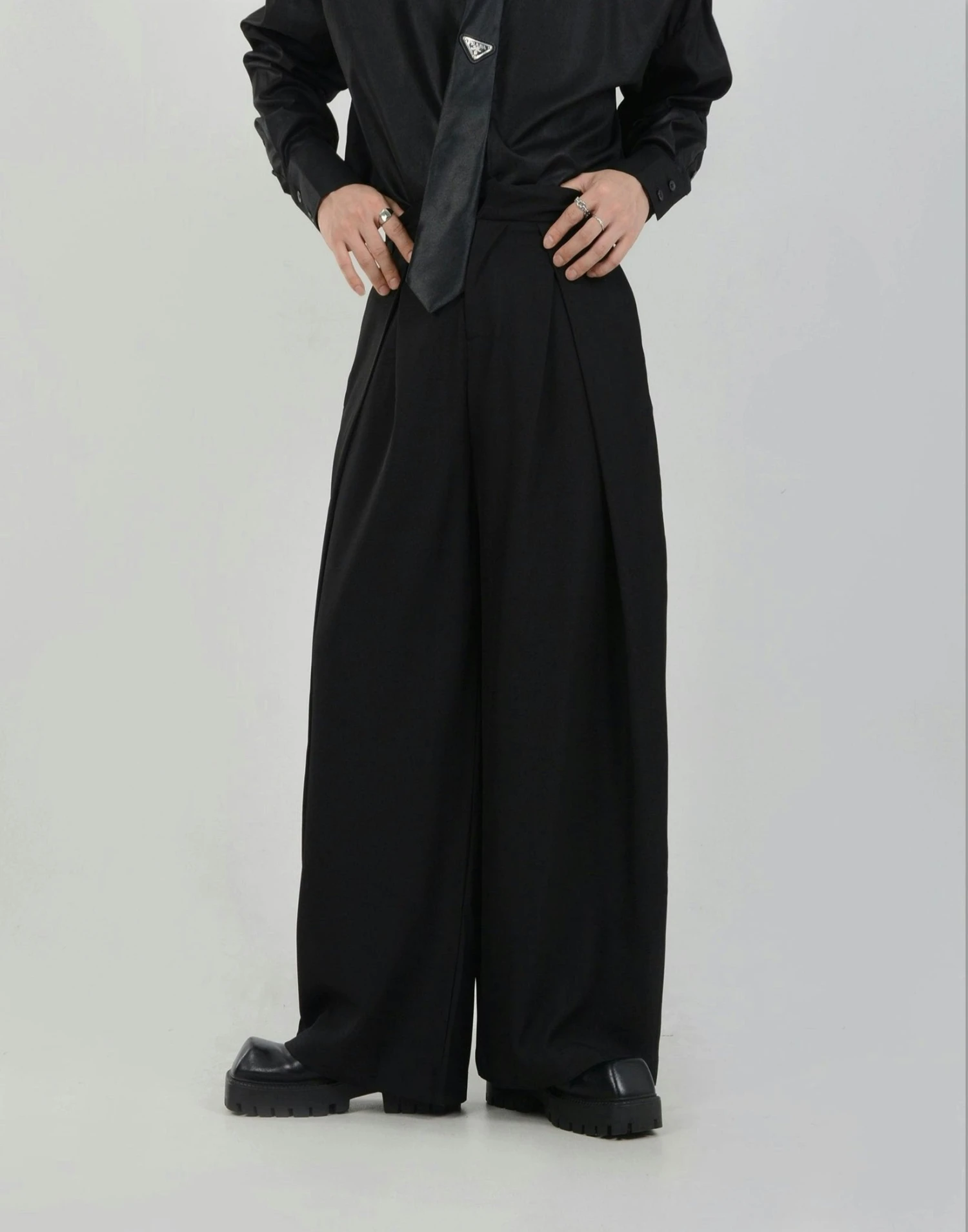 These trousers are crafted from a premium polyester blend, offering both durability and comfort with a hint of stretch. The pleated design and wide-leg cut combine to create a fluid silhouette that exudes confidence, while the solid color and minimalistic style ensure they remain a timeless staple.