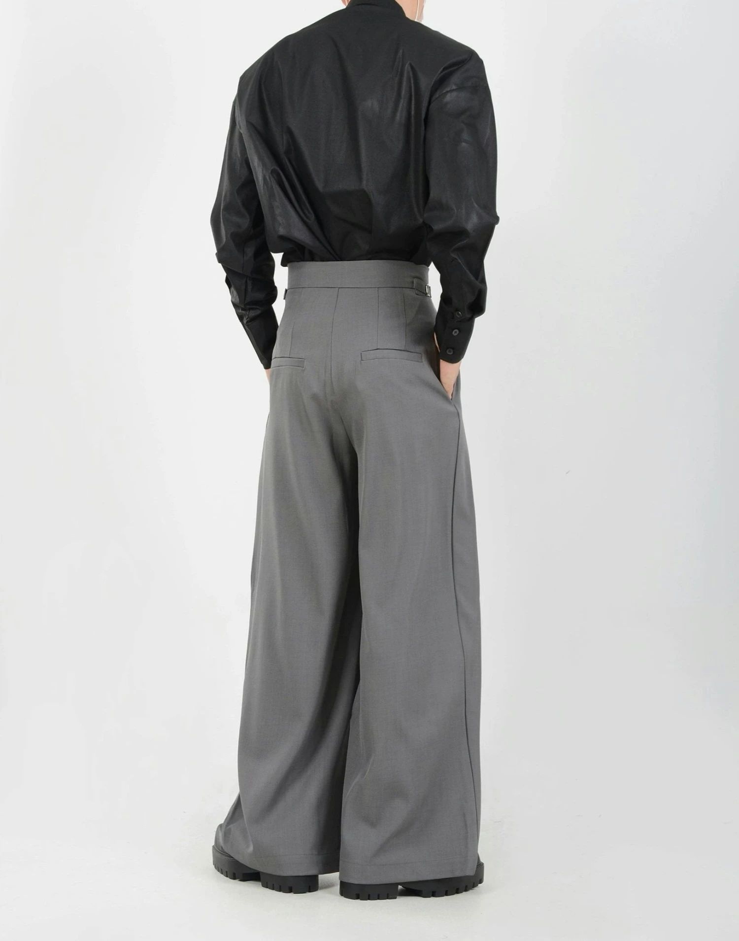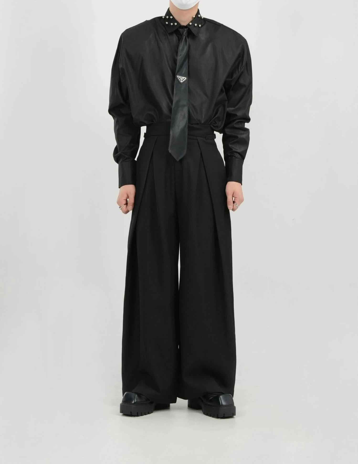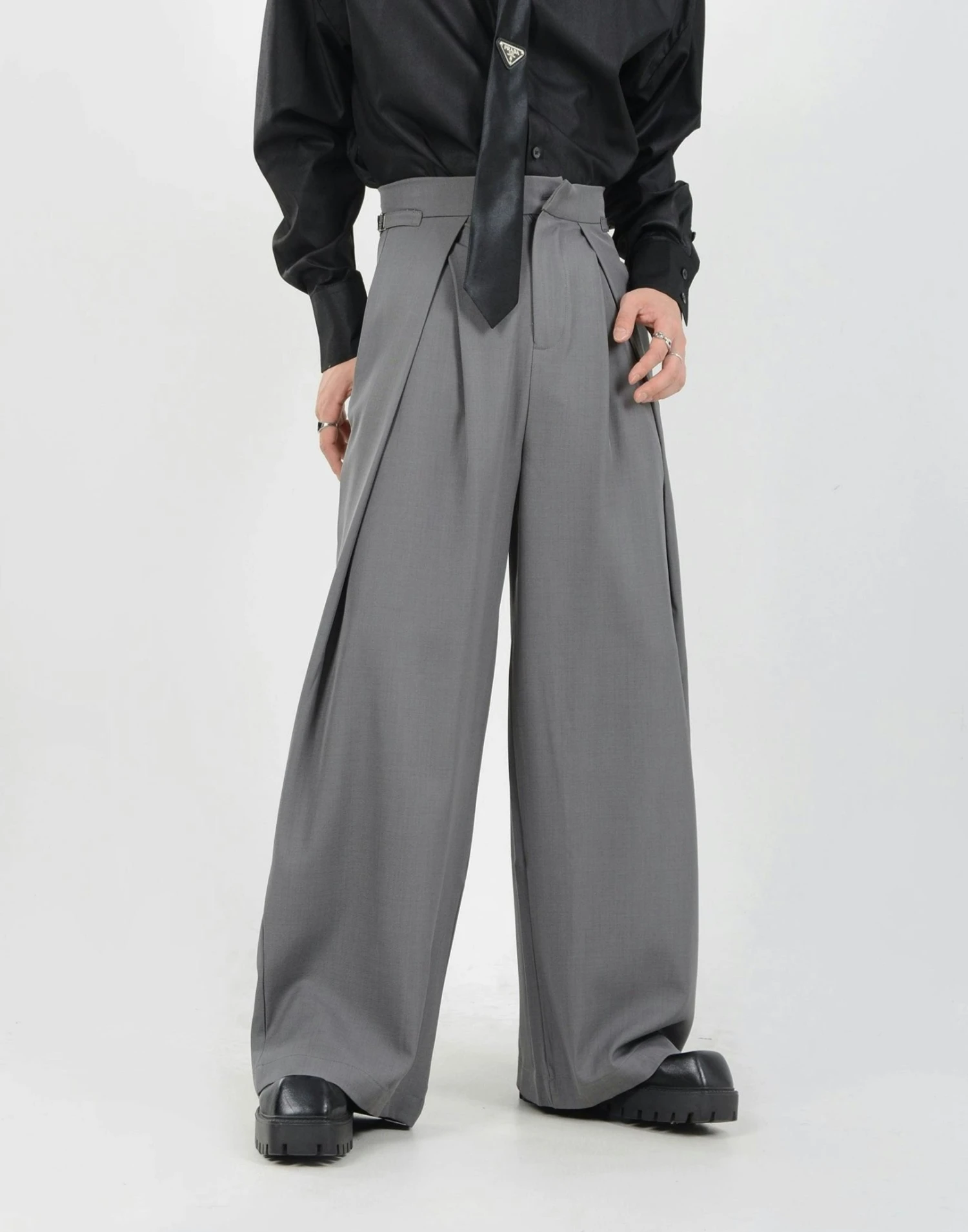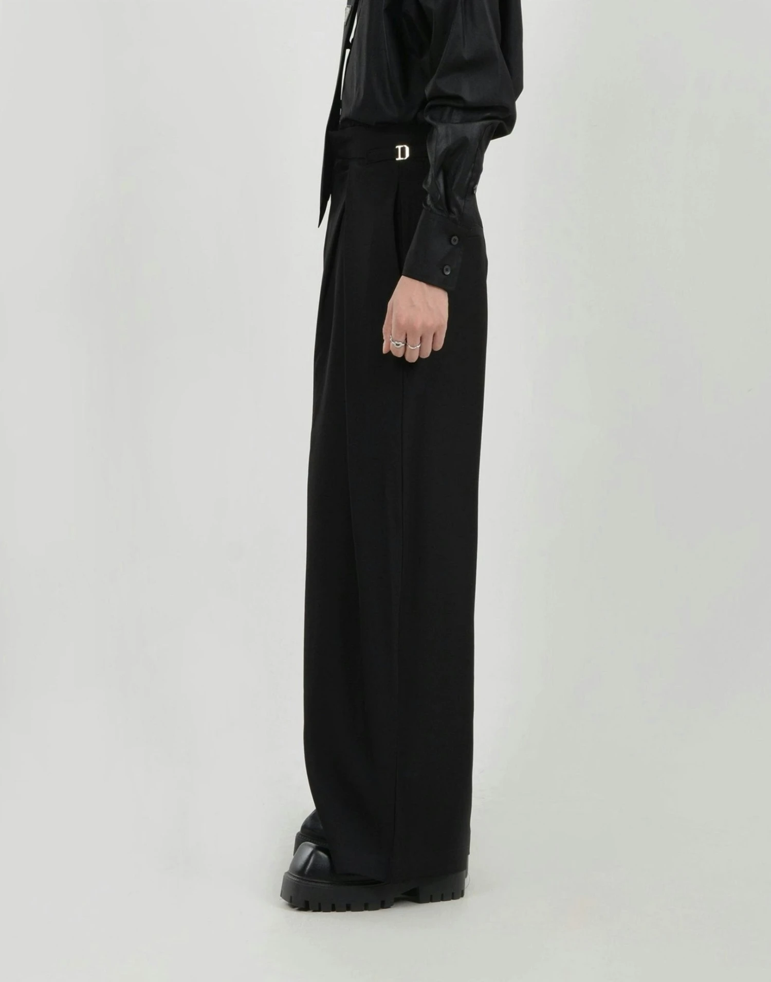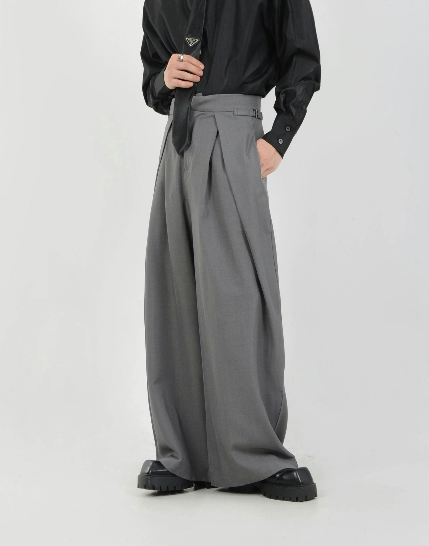 These trousers are crafted from a premium polyester blend, offering both durability and comfort with a hint of stretch. The pleated design and wide-leg cut combine to create a fluid silhouette that exudes confidence, while the solid color and minimalistic style ensure they remain a timeless staple.