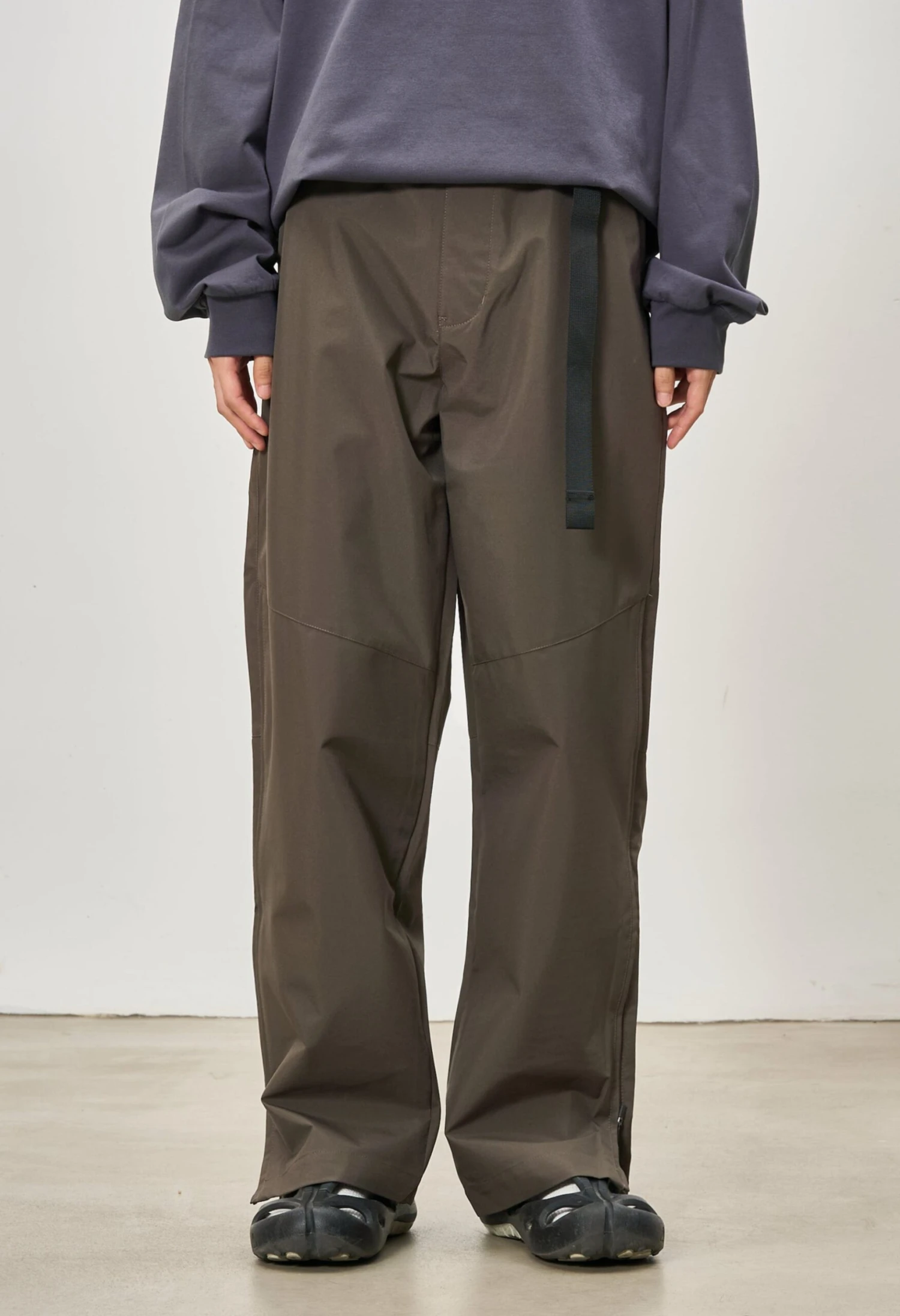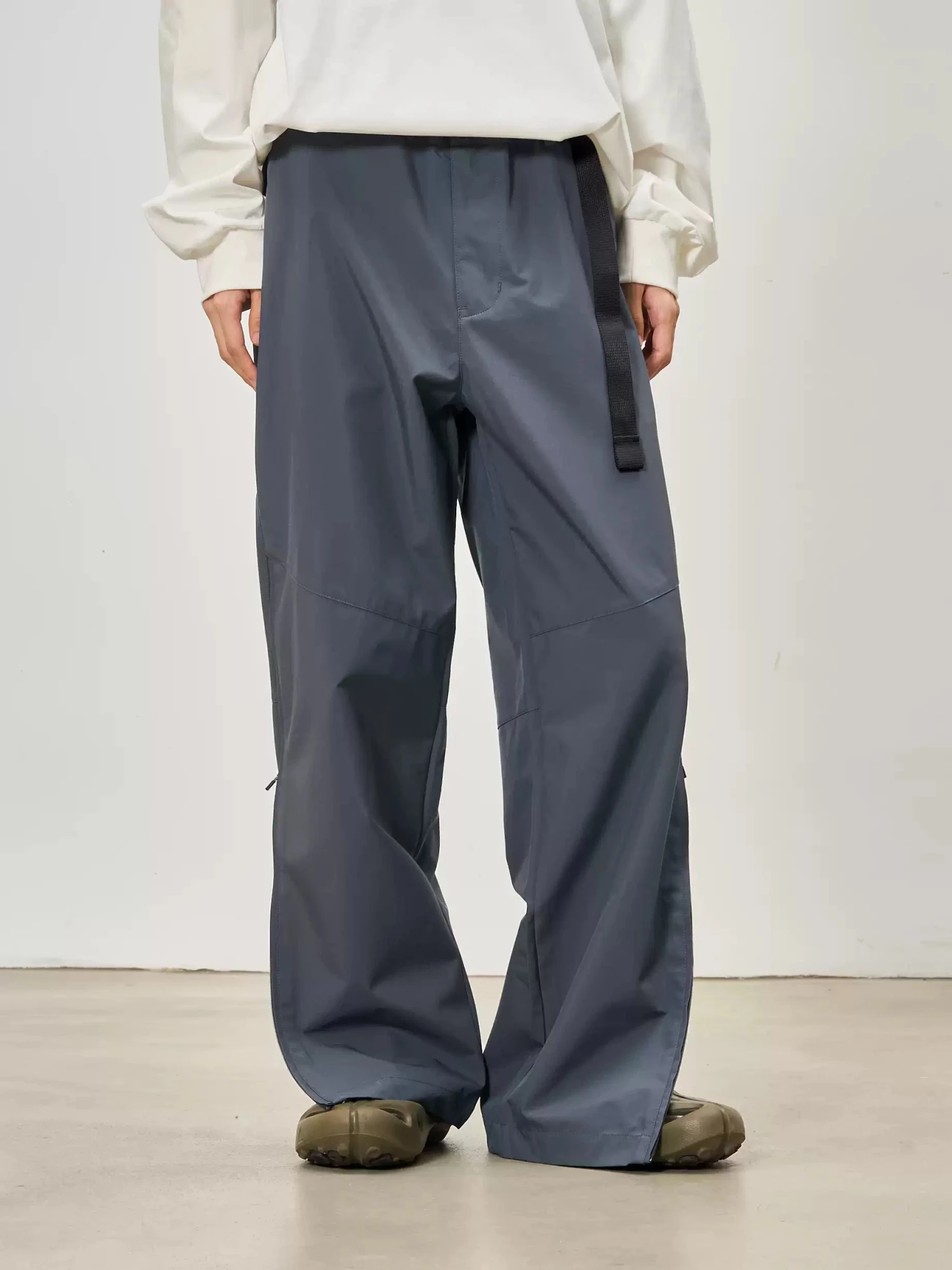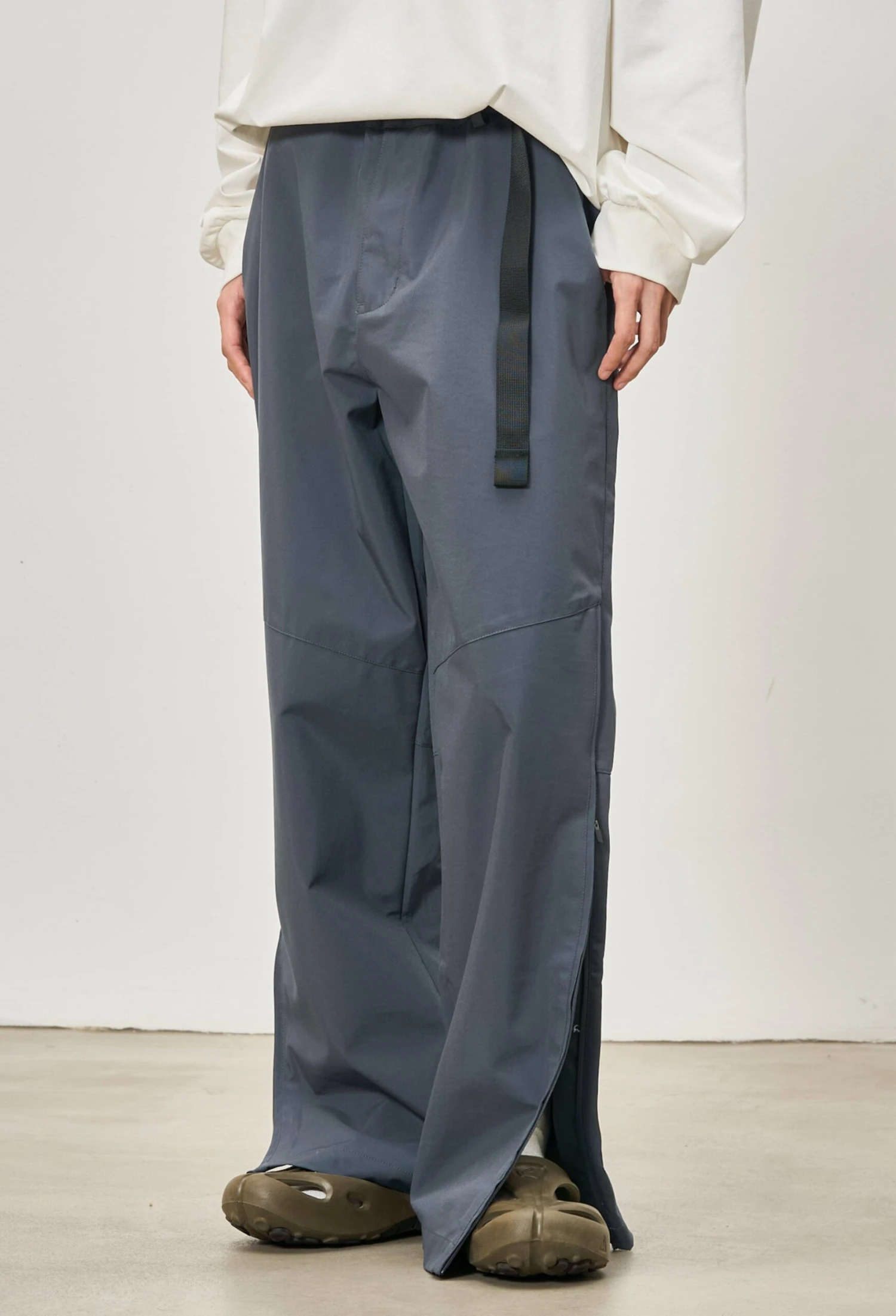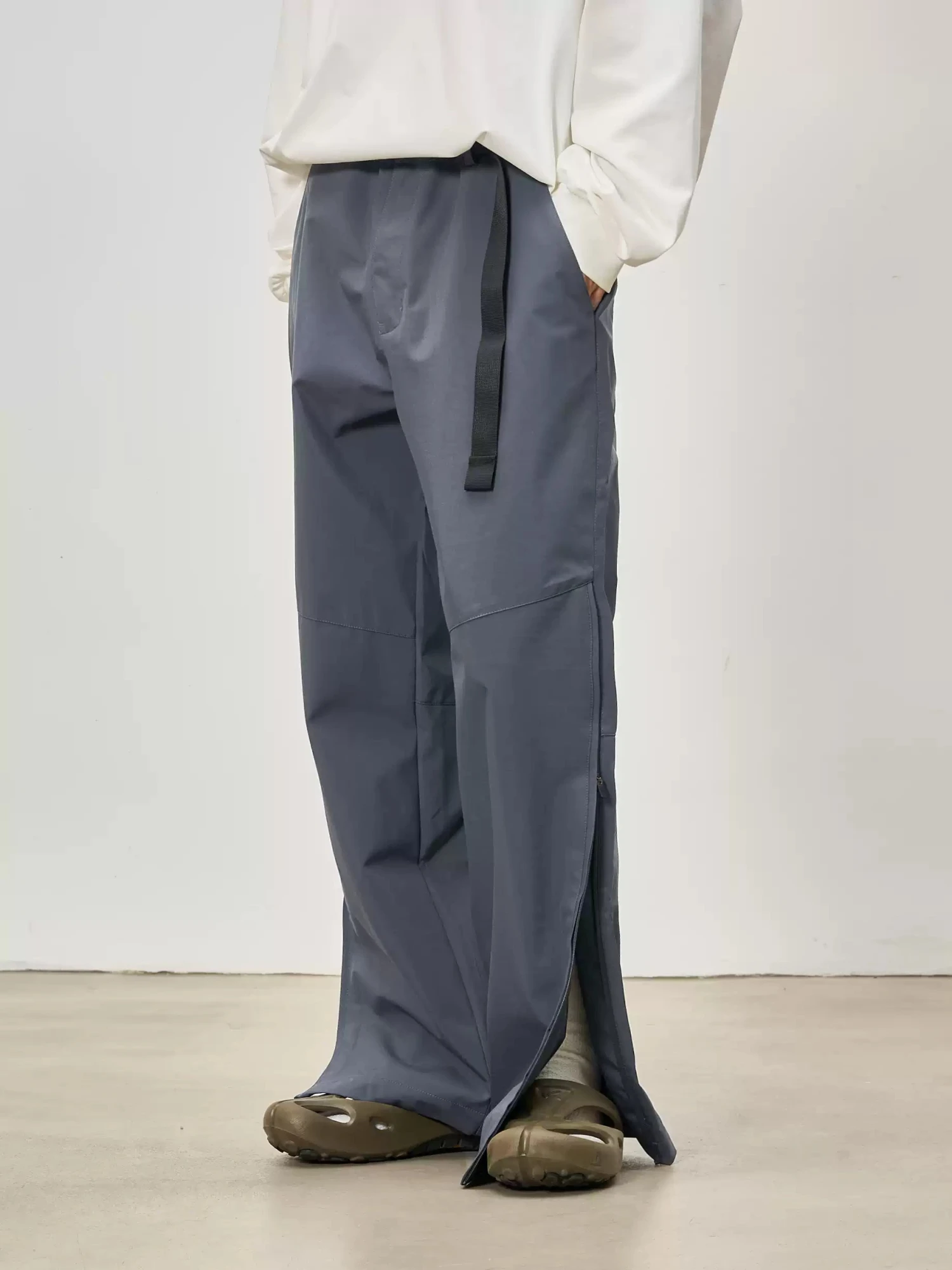 With an adjustable waist for a customizable fit and zipped side slits that let you switch up the silhouette, they blend versatility with a laid-back, modern edge. Crafted from a lightweight yet durable fabric, these trousers have a smooth, slightly structured drape that enhances their wide-leg cut. The material features a water-resistant finish, making them a practical choice for unpredictable days. Functional details like side pockets and a relaxed fit ensure all-day comfort without compromising on a clean, refined look.