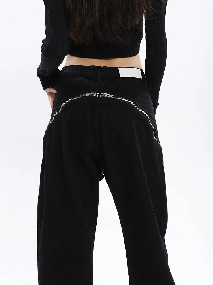Crafted from premium fabric, these pants exhibit meticulous tailoring with their semi-flared silhouette and bold zippered details. The jet-black shade and streamlined design deliver a sleek, urban vibe, while the versatile zipper accents offer customizable splits for a hint of rebellion in your step.